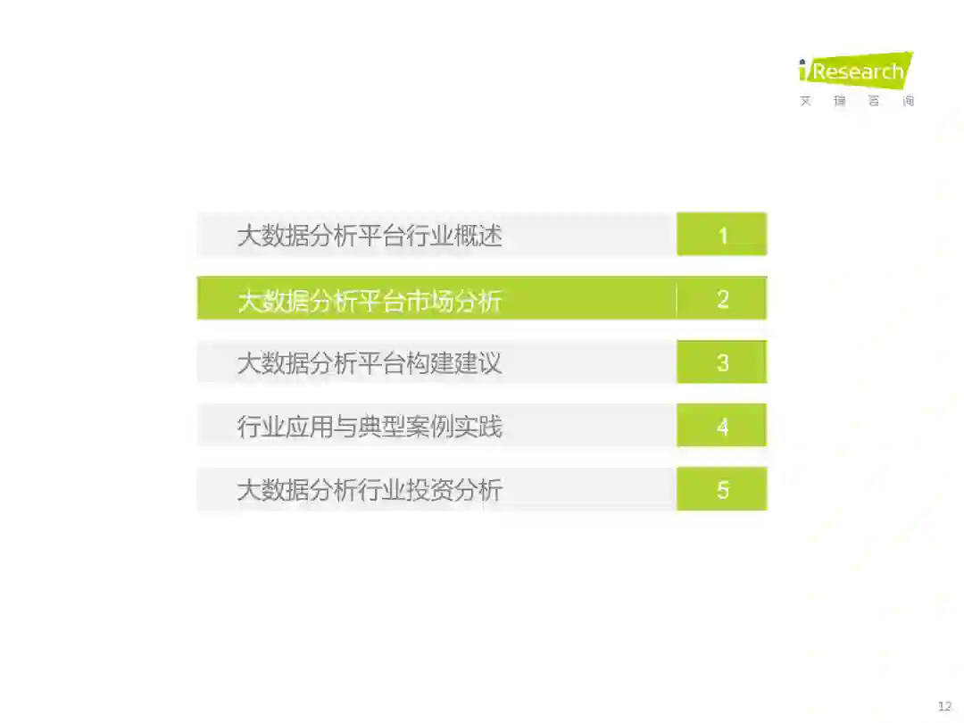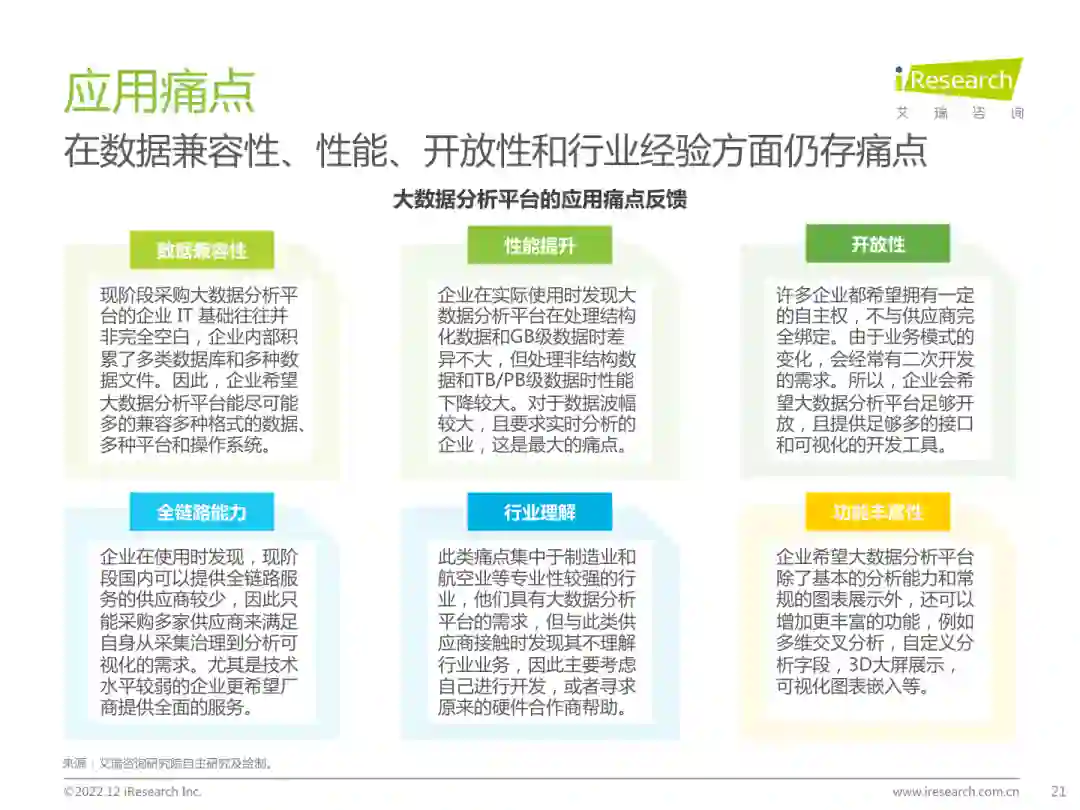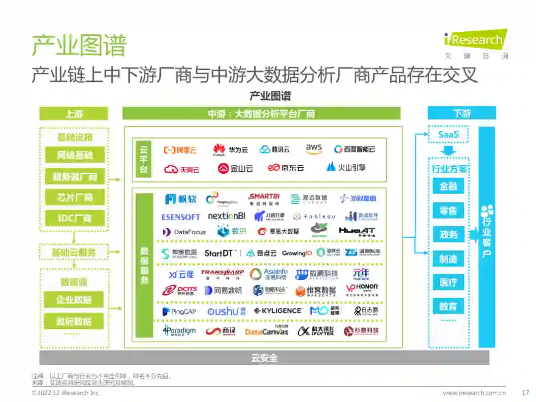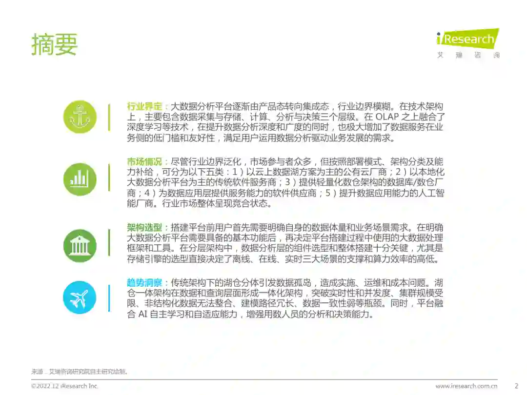 行业界定:大数据分析平台逐渐由产品态转向集成态,行业边界模糊。在技术架构上,主要包含数据采集与存储、计算、分析与决策三个层级。在OLAP之上融合了深度学习等技术,在提升数据分析深度和广度的同时,也极大增加了数据服务在业务侧的低门槛和友好性,满足用户运用数据分析驱动业务发展的需求。 市场情况:尽管行业边界泛化,市场参与者众多,但按照部署模式、架构分类及能力补给,可分为以下五类:1)以云上数据湖方案为主的公有云厂商;2)以本地化大数据分析平台为主的传统软件服务商;3)提供轻量化数仓架构的数据库/数仓厂商;4)为数据应用层提供服务能力的软件供应商;5)提升数据应用能力的人工智能厂商。行业市场整体呈现竞合状态。