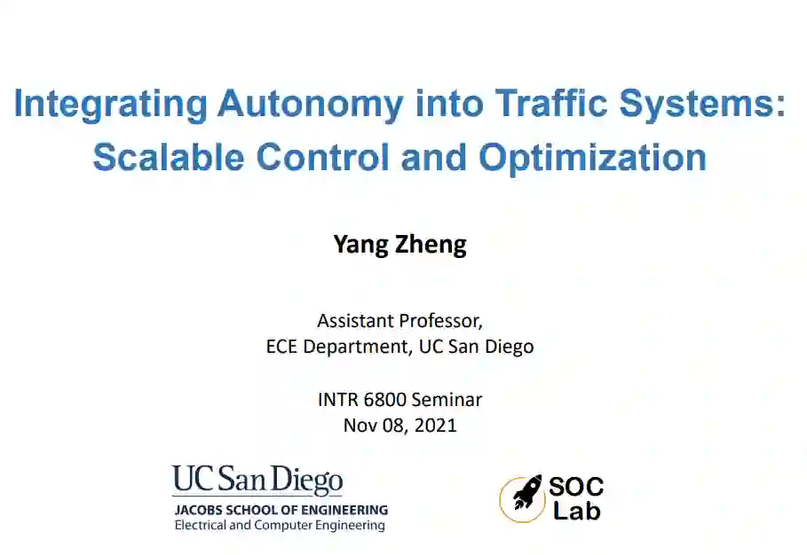 本演讲介绍了分布式控制和可扩展优化技术方面的贡献,这对于将自动驾驶汽车集成到现有交通系统中至关重要。特别是,我们将提供 CAV 在混合交通中的巨大潜力的理论证据,并进一步展示如何利用稀疏结构来设计可扩展的分布式算法,从而允许在大规模混合交通系统中操作 CAV。我们还将介绍领导巡航控制 (LCC) 的新概念,其中 CAV 不仅保持跟车操作,还领导 HDV 的运动。具体而言,LCC 旨在减弱下游交通扰动和积极平滑上游交通流。