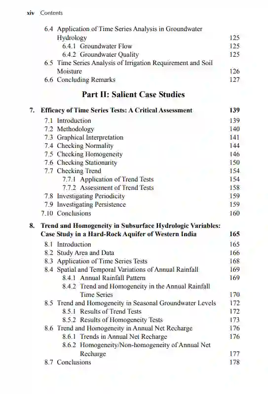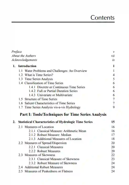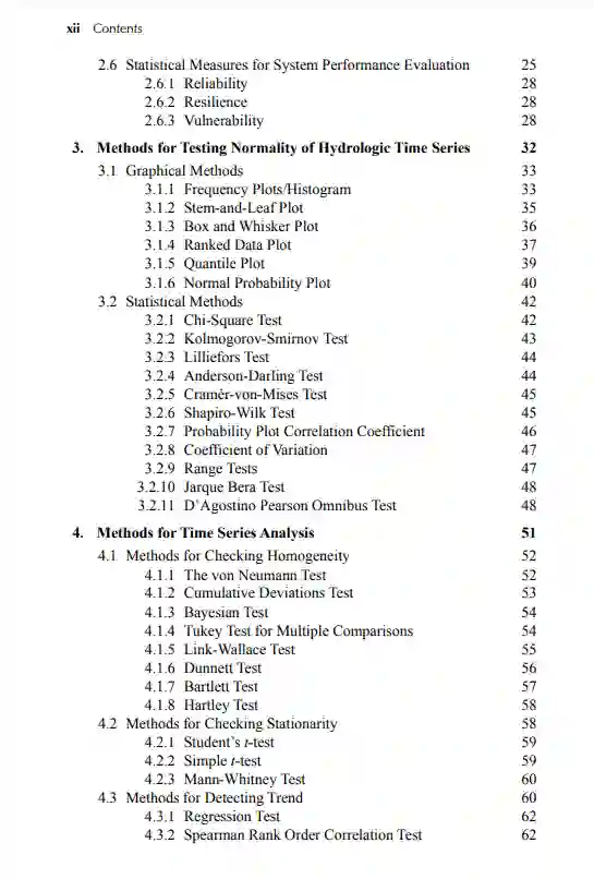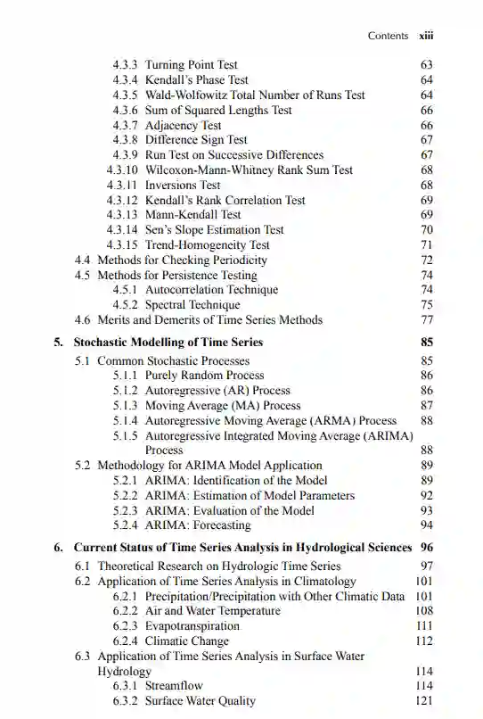 时间序列分析技术的理论和应用方面的相关书籍较少,特别是在水资源工程领域。因此,许多水文工作者和水文地质工作者难以将时间序列分析作为研究工具之一。这本书通过提供时间序列分析的理论和实践方面的适当混合填补了这一空白。它涉及水文/水资源工程中时间序列特征的全面概述、分析时间序列数据的各种工具和技术、31种可用统计检验的理论细节以及将它们应用于真实时间序列数据的详细程序、随机建模的理论和方法,以及水文科学中时间序列分析的现状。此外,它通过一个案例研究证明了大多数时间序列测试的应用,并对各种时间序列测试进行了比较性能评价,同时还邀请了印度和国外的四个案例研究。