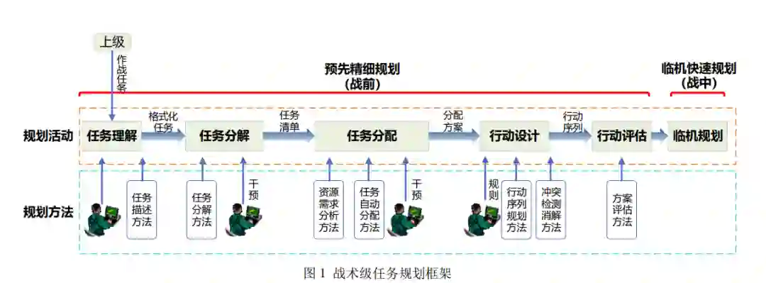 一体化联合作战存在作战样式多样、编制编成 多样、多兵种高效协同、武器平台多样、战场环境复 杂、战场态势高度动态等显著特点,且战争的过程和 结局不再简单取决于交战双方兵力兵器的数量,而 更取决于兵力兵器的联合运用效能。这些因素都决定了作战过程的复杂性,对全局态势认知、全面指挥 决策等能力提出很高要求,而指挥员及参谋作业机 构在分析力、计算力和反应力等方面都难以满足体 系对抗环境下的现代战争需要,亟需探索实用化的 手段方法,通过精算细算实现精确化作战方案的快 速生成[1]。这是实现联合作战、精确作战、敏捷作战 的必然要求,能够高效支撑各兵种各要素及异构武 器装备作战能力的深度铰链一体运用,达到信息化 条件下体系致胜的目标,实现多军兵种在全域作战 空间下的体系对抗[2]。 作战任务规划依托数据、模型和信息处理设备, 为实现智能决策、敏捷指挥、精确控制提供了有效手 段,已成为武器装备智能化无人化转型升级和提升 体系化作战效能的主要途径[1]。 在联合作战中,作战任务规划从层次上可划分 战略战役级、战术级和平台级 3 层任务规划体系,3 级规划功能从宏观到微观有序衔接,依次侧重作战 设计、行动设计和动作设计,规划成果逐步细化。 战略战役级任务规划更多依赖指挥艺术实现指 挥决策;平台级任务规划与平台型号紧密关联;战术 级任务规划围绕多军兵种协同作战,在联合层面实 现军兵种多群(队)间作战资源与行动的协同规划, 在军兵种内部实现兵种间要素间多群(队)作战资源 与行动的协同规划,两者均是解决作战资源的一体 化管理调度问题,采用的方法相同,专业计算模型有 差异。 战术级任务规划在整个体系中起到承上启下的 作用,是当前亟需突破的工程难点和研究热点,其规 划对象、规划内容和影响因素最为复杂,需要研究大 量的自动分析方法进行支撑,因此,本文在总结任务 规划系统建设、任务规划方法框架的基础上,重点总 结战术级任务规划作业过程中涉及的主要模型和方 法的发展现状,并分析其存在的局限性,结合武器装 备发展与现代战争演进趋势,聚焦能力需求分析提 出了战术级任务规划方法的发展方向。