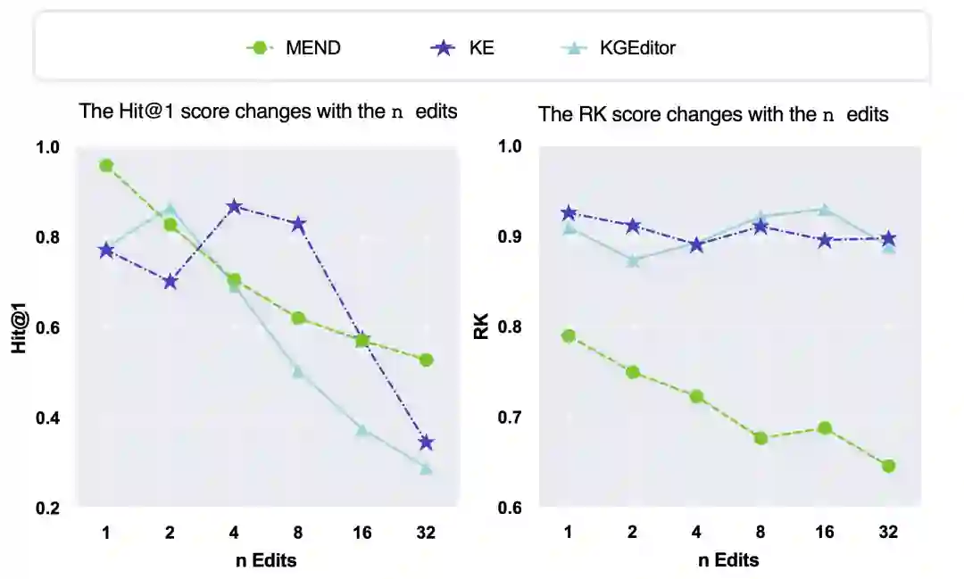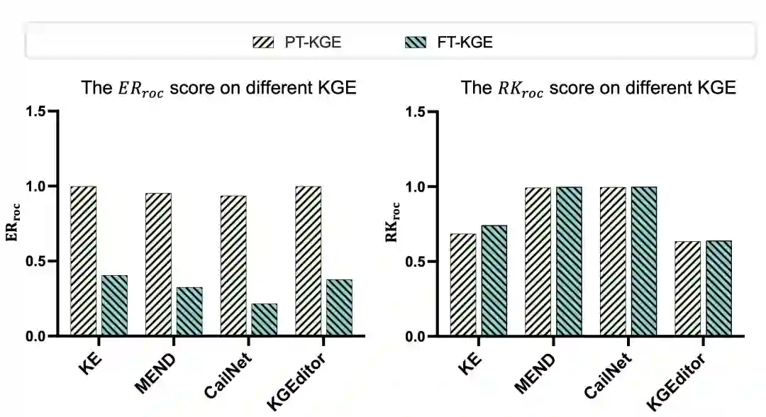 **Success@1 metric (Succ@k): **KGE编辑的可靠性是通过链接预测来判断是否将原有错误的知识成果修改回来。为了验证编辑效果的有效性,本文采用了知识图谱补全的设定,即通过对候选实体分数进行排名,生成一个实体列表。通过计算正确实体出现在位置来定义修改后的模型的可靠性,定义为Success@1 metric (Succ@k),其公式如下: **Retaining Knowledge Rate of Change: **知识稳定性是试图去评估编辑方法在成功更新特定三元组知识时,是否对知识图谱表示模型获取的其余知识带来了影响。本文这里主要采用两种评估方式来探究编辑方法对于知识图谱表示模型的影响大小,分别是知识保持率和知识的变化率。知识保持率Retain Knowledge (RK@k)代表的是原始模型预测的实体,在编辑完成后仍然能够正确推断出来的概率。首先本文设定了一个专门用于稳定性测试的数据集:L-test。L-test数据集收集了原始模型预测出来的Top 1的三元组数据,作为观测数据集。如果编辑前后的KGE模型预测相对应的三元组预测保持不变,则认为编辑遵循知识局部性,即不会影响其余事实。通过计算保留知识局部性的比例作为知识编辑稳定性的衡量标准,其定义如下所示: 其中代表从稳定性数据集中抽取出来的数据。是由或者参数化的模型函数。表示带参数的模型,预测的rank在以及以下的个数。 **Edited Knowledge Rate of Change: **为了更好观察编辑对稳定性影响的大小,本文引入了两个额外的指标来衡量编辑带来的影响大小。即编辑知识的变化率(Edited Knowledge Rate of Change)和保留知识的变化率(Retaining Knowledge Rate of Change),两个公式定义如下: 其中 和 表示编辑前后测试集的平均Rank排名。和 表示编辑前后L-Test测试数据集的平均Rank排名。