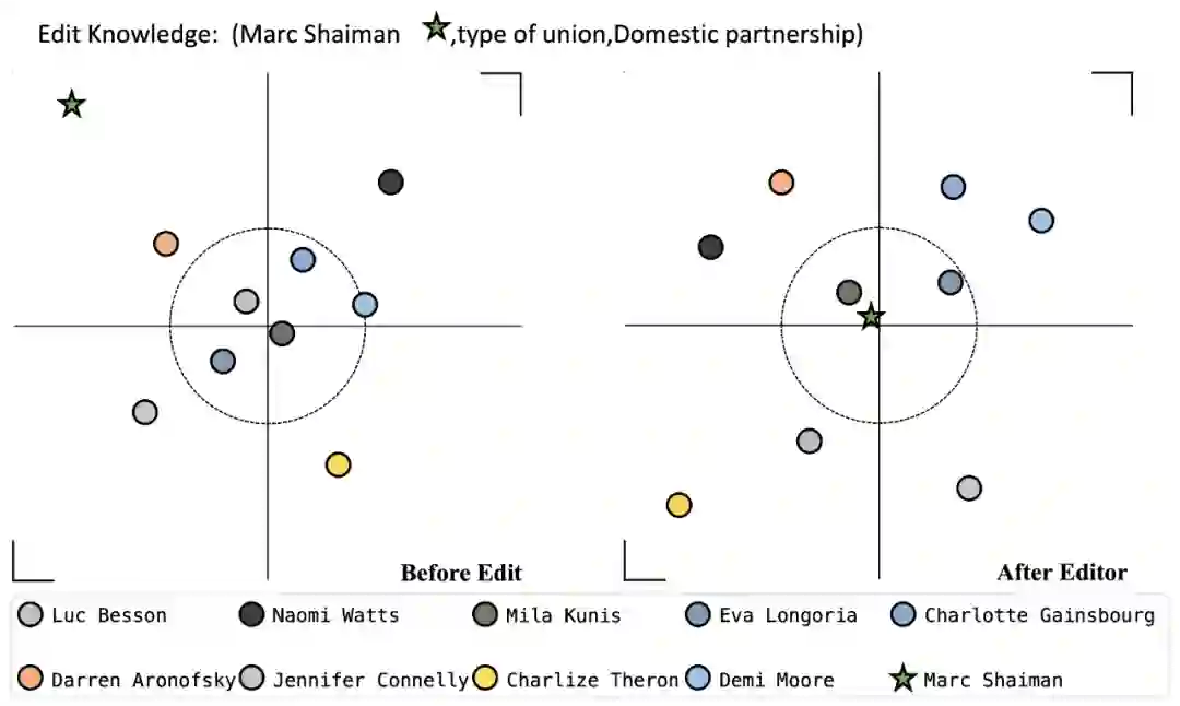我们随机挑选了一个编辑的Case,并通过可视化展示了编辑前后的实体变化来更清晰地观察KGEditor的性能表现。下图展示了知识编辑应用前后,预测实体位置的显著变化。即在对模型进行编辑后,正确的实体明显靠近圆心,展示了编辑KGE模型的有效性。