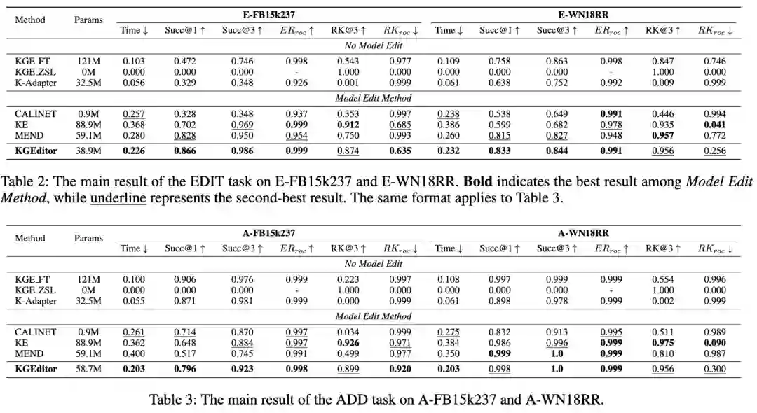 3.1 实验结果 本文利用现有的一些主流知识编辑范式与KGEditor进行比较,其中具体包括CALINET、MEND和Knowledge Editor。为了对照,本文对一些其他基础范式基线也进行了对比,首先是直接在少量更新知识上进行微调的范式和Zero-Shot的方法。其次对于K-Adapter这种使用额外参数的方法与CALINET进行比较,其中具体的实验结果如下所示。