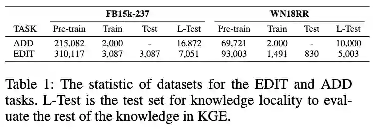 ADD Task:对于ADD任务数据集构建,本文采用了知识图谱补全任务中的归纳推理任务设定(利用已有的知识图谱中的信息来预测或推断缺失的关系和实体),测试数据集中的实体知识都是在训练中没有见过的,所以可以看作为新增的知识。 在FB15k-237和WN18RR上本文都采用相同的数据集设定,处理方式也保持一致。通过以上操作,本文最终可以得到以下四个数据集:E-FB15k237,A-FB15k237,E-WN18RR,和A-WN18RR。其中具体的统计如表所示: