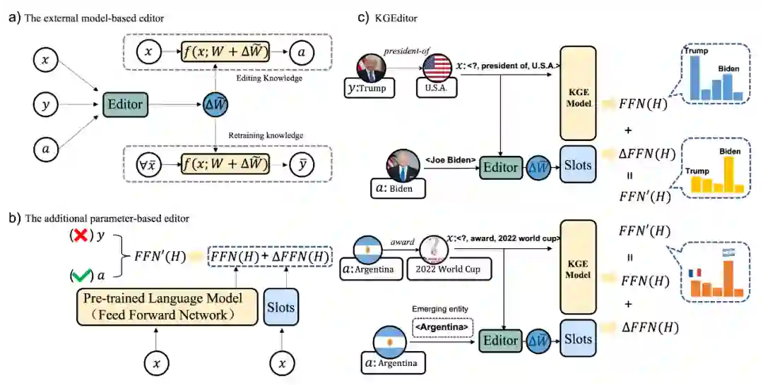 然而,现有的知识图谱嵌入模型一般是作为一个静态工件被部署在服务中,一经训练好知识图谱表示模型就很难适应新出现的实体以及处理事实知识发生修改的情况,比如,如果让一个在2021年以前训练的知识图谱表示模型去预测<美国、现任总统、?>,那么它最有可能给出的答案是唐纳德·特朗普。但是随着美国总统大选举行,总统换届,到2021年总统就变成了乔·拜登。因此,如何高效地修改其中过时或错误的知识成为了一个挑战。为解决这一问题,本文提出了一种基于预训练语言模型的知识图谱嵌入编辑方法——KGEditor。不同于直接编辑大型语言模型内部的知识,知识图谱嵌入编辑是针对知识图谱中的事实性知识进行操作。并且编辑知识图谱嵌入需要考虑知识的复杂结构,比如一对多,多对多等知识结构。