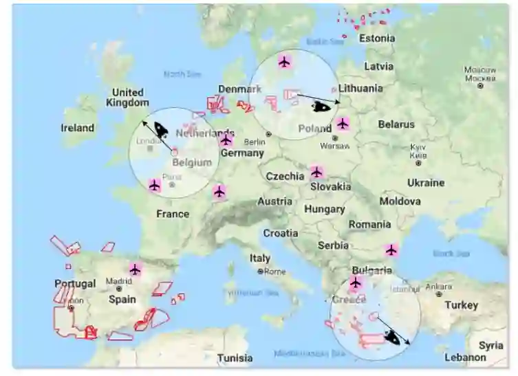 图 3.6: 军事案例研究 - 从发射区探测可能受影响的民用机场域的导弹射程