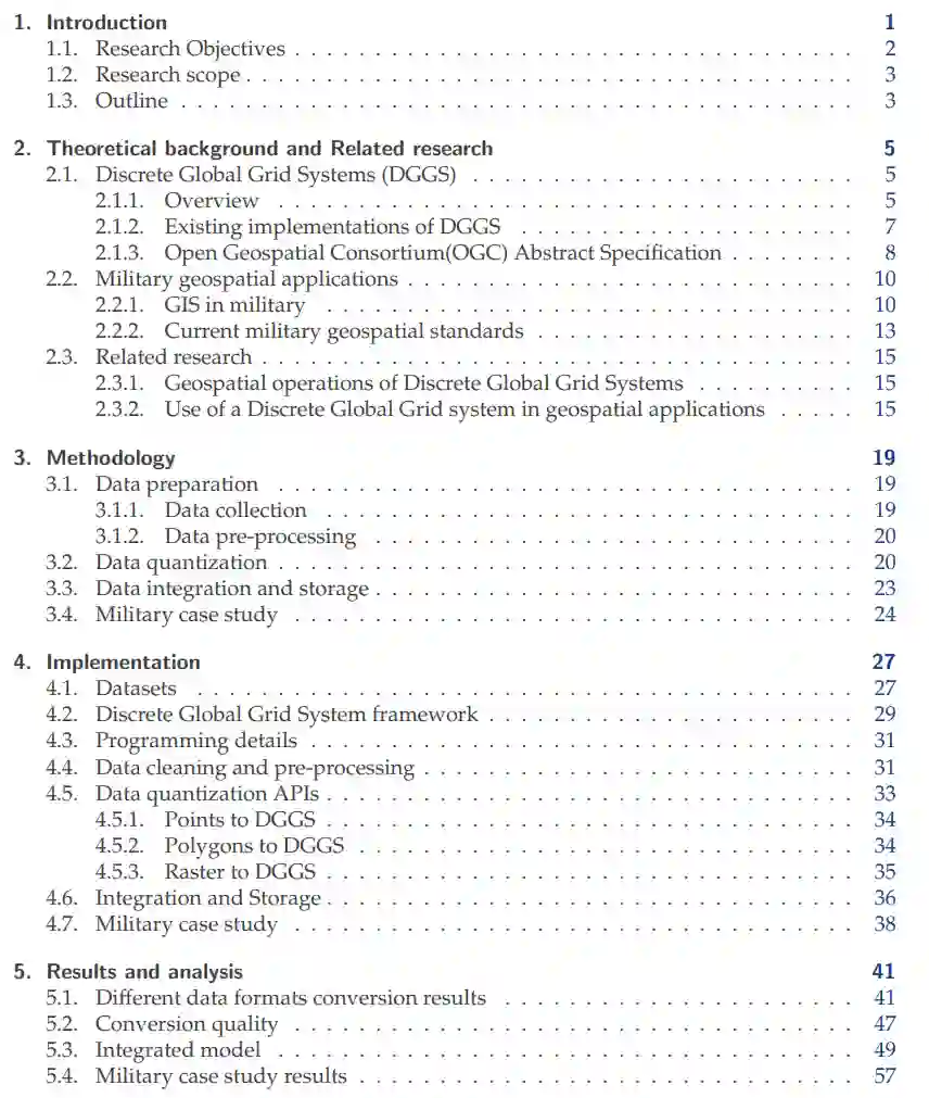 本文正文由导言和五个主要章节组成。第 2 章介绍本论文的理论背景和相关研究。讨论了离散全球网格系统(DGGS)的基本理论和概念、现有实现以及开放地理空间联盟(OGC)的抽象规范。随后,本章讨论了军事地理空间应用、地理信息系统 (GIS) 和地理空间数据在军事中的使用,以及与研究范围相关的现行军事地理空间标准。第 3 章概述了用于实现本论文研究目标的方法。从概念上解释了该方法的不同步骤。第 4 章将进一步详细介绍方法的实施。第 5 章介绍了该方法的结果以及对这些结果的分析,以实现研究目标。最后,第 6 章给出了本论文的结论。论文回顾了研究问题,以确定目标的实现程度,随后讨论了方法论的局限性。最后,在结果分析的基础上,讨论了对该主题未来研究以及未来工作的建议。