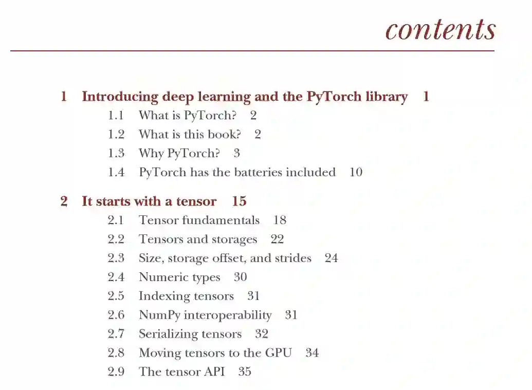 第一章是入门内容介绍,主要介绍了什么是 PyTorch和为什么我们要选择 PyTorch,以及对本书内容层次的总体介绍,让刚刚入门的读者能够开门见山,大量的插图介绍了深度学习和Pytorch的概念。