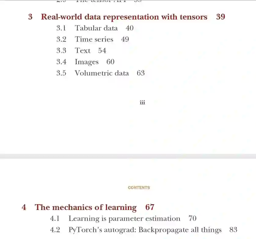 第三章开始则通过张量和真实世界的数据进行联系,说明了如何使用张量表示表格、时序、图像和文本等数据。