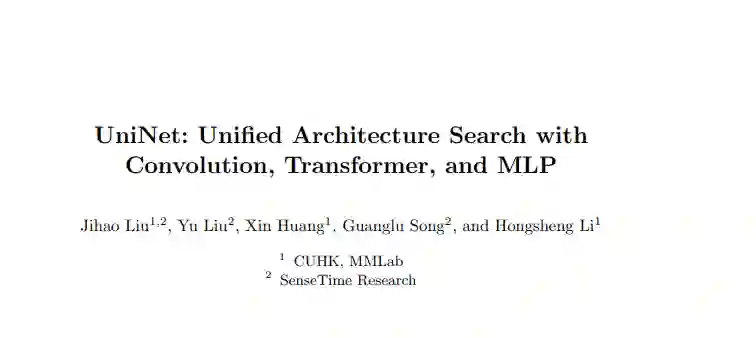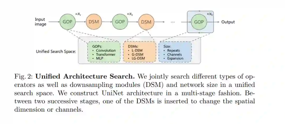 近年来,transformer和多层感知器(MLP)架构在各种视觉任务中取得了令人印象深刻的成果。然而,如何有效地将这些运算符组合在一起,形成高性能的混合视觉架构仍然是一个挑战。在这项工作中,我们通过提出一种新的统一架构搜索方法来研究卷积、transformer和MLP的可学习组合。我们的方法包含两个关键设计来实现对高性能网络的搜索。首先,我们以统一的形式对不同的可搜索运算符进行建模,从而使这些运算符可以用相同的一组配置参数来表征。这样,整体搜索空间的大小大大降低,总搜索成本变得可以承受。其次,我们提出了上下文感知下采样模块(DSMs),以减轻不同类型操作之间的差距。我们提出的DSM能够更好地适应不同类型运算符的特征,这对于识别高性能混合架构非常重要。最后,我们将可配置算子和DSM集成到一个统一的搜索空间中,并使用基于强化学习的搜索算法进行搜索,以充分探索这些算子的最优组合。为此,我们搜索了一个基线网络,并将其扩大,得到了一个名为UniNets的模型家族,它比以前的ConvNets和transformer取得了更好的精度和效率。特别地,我们的UniNet-B5在ImageNet上实现了84.9%的top-1准确率,比efficient - net - b7和BoTNet-T7分别减少了44%和55%的失败。通过在ImageNet-21K上进行预训练,我们的UniNet-B6达到87.4%,性能优于Swin-L,失败次数减少51%,参数减少41%。代码可以在https://github.com/Sense-X/UniNet上找到。