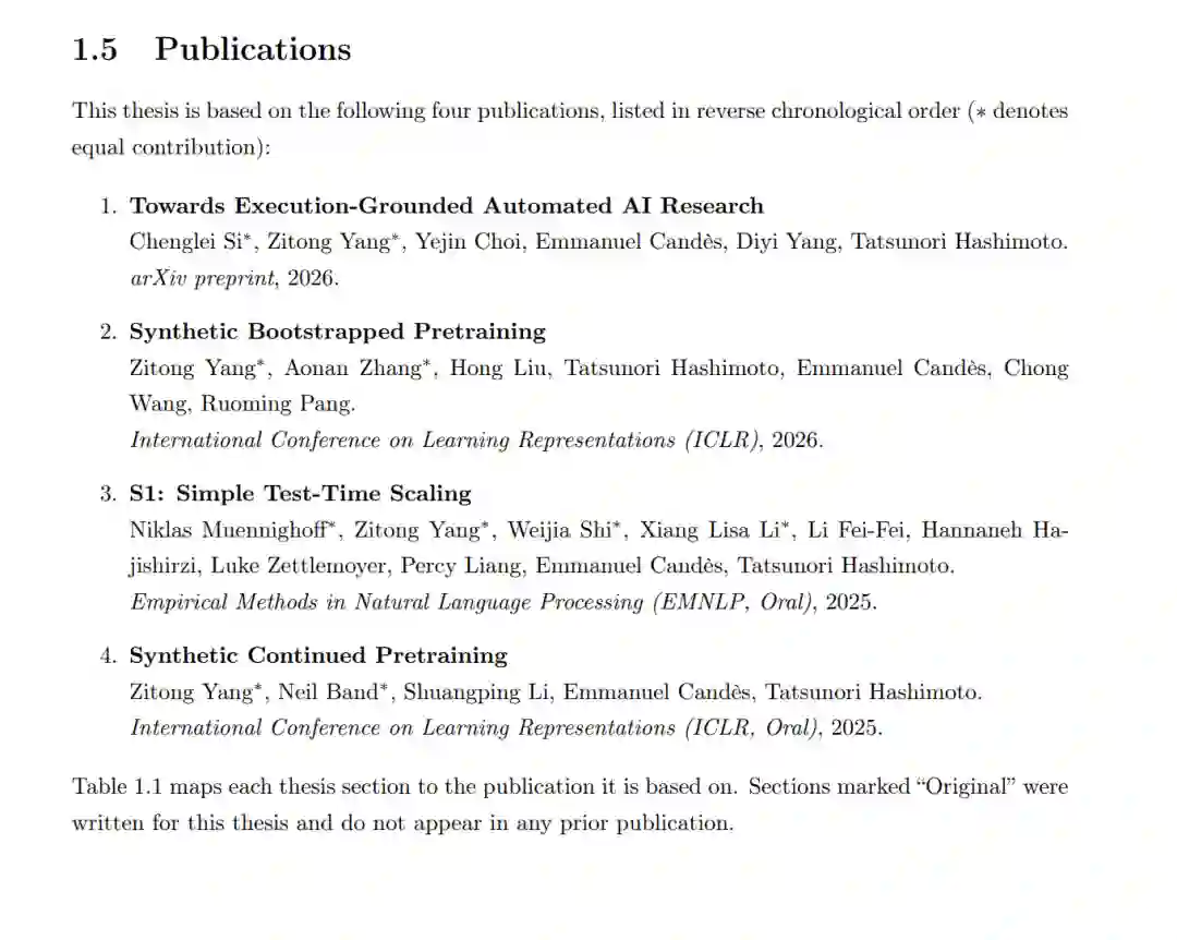 摘要: 现代基于语言模型的人工智能系统展现出了卓越的性能,然而,其能力在三个关键维度上仍受到人类创造者的根本性限制。首先,尽管模型权重可通过微调(fine-tuning)进行更新,但在预训练(pre-training)阶段之后,从规模较小的专业语料库中获取新知识的效率依然极低。其次,此类系统的训练高度依赖于历史上有限的人类生成数据。第三,现有的 AI 模型训练管线仍受限于人类研究人员所能发现并探索的算法范畴。 本论文为攻克上述固有局限迈出了初步尝试,通过三个章节的研究,旨在打破这些依赖关系,进而构建持续自我改进的人工智能(continually self-improving AI)。 * 针对知识获取中的数据效率瓶颈:我们提出了一种合成数据方法,将有限的语料库进行多样化扩展并增强为丰富的知识表示,使模型能够有效地利用稀缺的原始素材完成参数更新。 * 针对人类数据依赖问题:研究表明,在给定固定规模的人类数据前提下,模型可通过自生成合成数据来**自举(bootstrap)**其基础预训练能力,且无需从任何现成的指令微调语言模型中进行蒸馏(distillation)。 * 针对人类工程化训练范式的局限:我们证明,通过在测试时(test time)对算法空间进行大规模搜索,AI 能够探索比人类研究人员手动尝试更为广阔的学习算法配置空间。