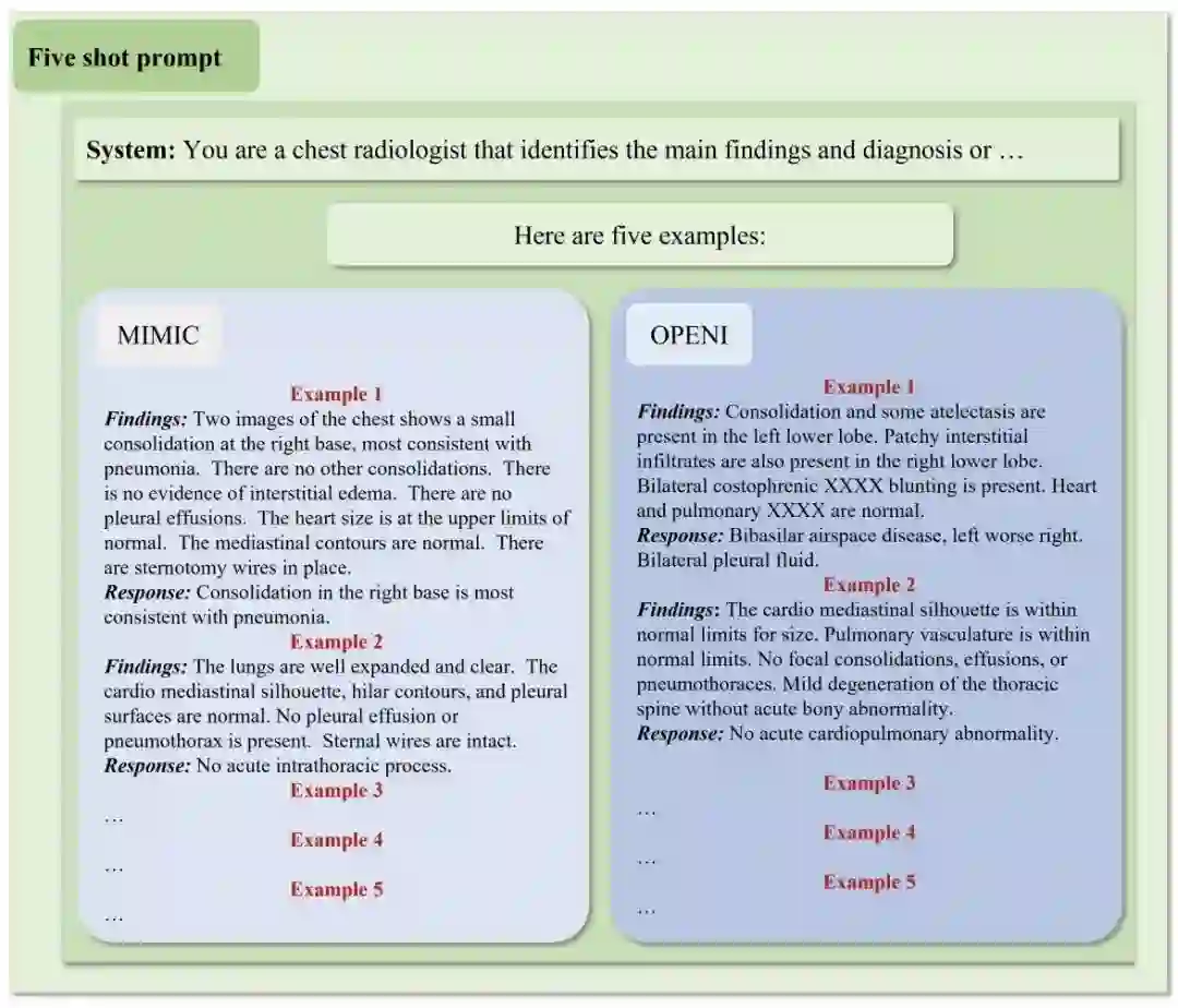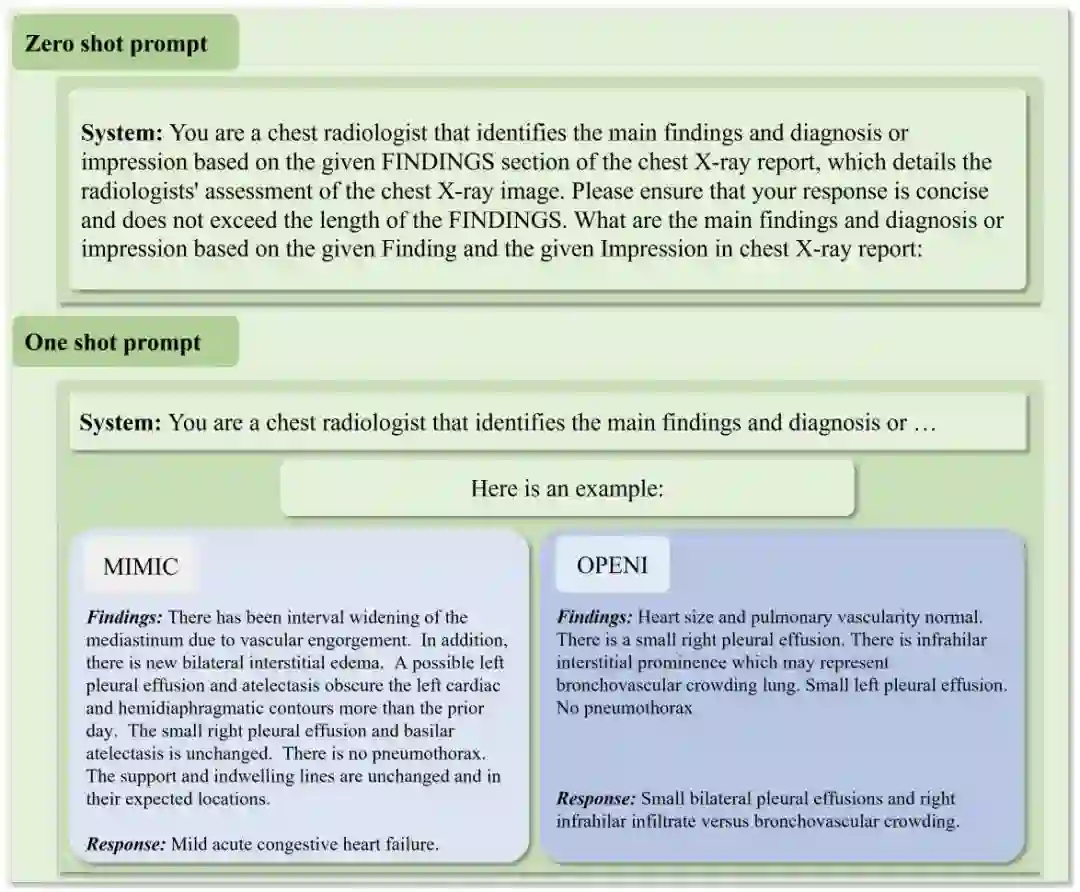 为了确保在不同的 LLM 之间进行公平而公正的比较,不论是 zero-shot、one-shot,还是 five-shot 的情形,我们都严格遵循相同的提示设置,保持了一致性。在 zero-shot 评估中,模型将面对全新的任务,没有任何之前的示例可供参考。而在 one-shot 的情景下,我们向模型提供了一个先前的示例作为参考。同时,在 five-shot 的情况下,模型将得到五个示例供其学习。所有的示例都是结合医疗建议严格挑选、设计。这些评估场景旨在模拟真实世界的使用条件,其中模型只获得有限数量的示例,并需要从中推导出通用规则。