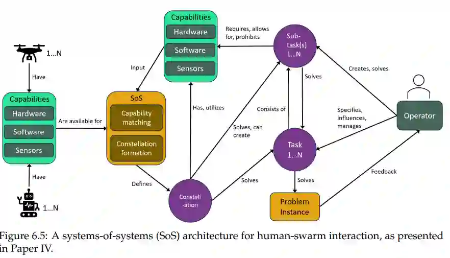 本文研究的问题是为人类操作员指挥无人机群设计有效的交互机制和界面,特别是应对管理大量无人机、支持操作员的态势感知以及平衡集中控制和分散控制等挑战。该研究强调了通过引入替代概念模型来重新思考传统方法的必要性,例如 “合唱团 ”隐喻,它将无人机群重新想象为协调的、半集中化的集合体,而不是纯粹新兴的、分散的集体。这一隐喻旨在平衡无人机群通常不可预测的集体行为与作战环境中所需的可预测的定向行动。通过展示如何在人机交互系统架构中实现这一隐喻,本论文为人类与自主系统的交互概念化提供了新的途径。