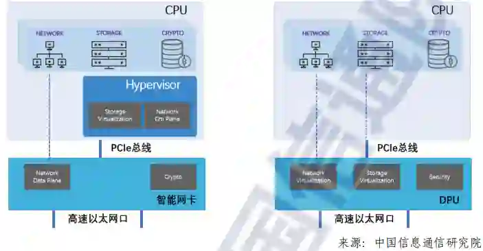 我们将智能网卡和DPU都称为广义上的DPU,以异构高能效方式实现的数据平面加速和卸载单元是 DPU 区别于 CPU 通用算力的关键。只有PPA(Performance PowerArea,性能、功率、面积)远高于通用CPU技术的数据处理单元,才能担负起将以“计算为中心”的数据处理逻辑改变为“以数据为中心”的重任,而采用通用CPU 架构实现数据平面加速的DPU,是向DPU最终形态演进的过渡形态。因此,广义上的 DPU 是基于异构 DSA(Domain Specific Architecture,领域专用架构)架构,采用软件定义技术路线,支撑基础设施资源层虚拟化,具备提升计算系统效率、降低整体系统的总拥有成本(TCO)能力,为高带宽、低延迟、数据密集的计算场景提供计算引擎的专用处理器。后摩尔时代,算力的持续提升成为数据中心高质量发展的重要保障。DPU作为继CPU、GPU之后的又一类芯片,核心的价值需算力卸载、算力释放、算力扩展等方面实现。