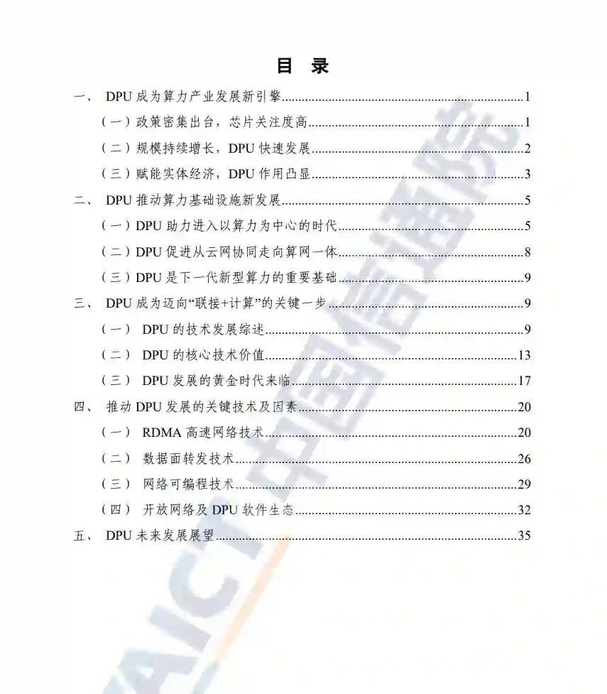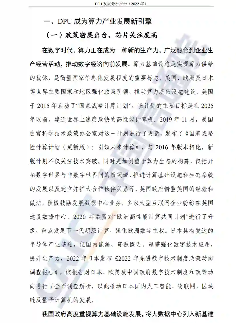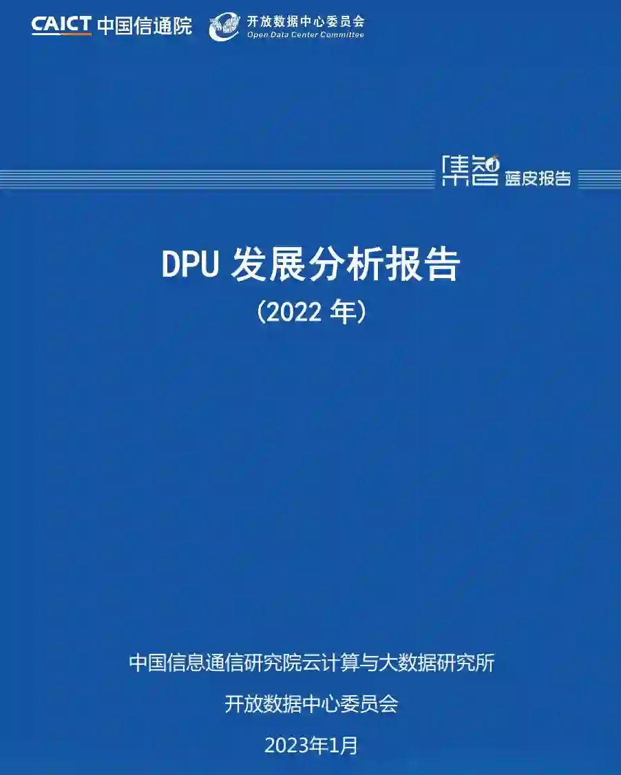 DPU的发展为当前计算模式带来全新变革,通过算力卸载、算力释放、算力扩展等技术,实现“联接+计算”的双向驱动,显著提升计算效率,加速异构算力高效互联,为“东数西算”等场景提供重要支撑。DPU也被视为数据中心继CPU、GPU后的“第三颗主力芯片”,具有重要的发展意义。2023年1月7日,在“2023中国信通院ICT+深度观察报告会”算网融合发展分论坛上,中国信息通信研究院联合开放数据中心委员会发布了《DPU发展分析报告(2022年)》。本报告从产业政策、产业规模、赋能经济三方面,对算力进行详细阐述,分析了数字基础设施发展需求。同时,综合考虑DPU技术及产业等发展要素,重点对DPU技术热点及核心价值进行了梳理,从RDMA高速网络、数据面转发、网络可编程、开放网络及DPU软件生态等方面分析了DPU发展的关键技术,并从政策驱动、技术创新、应用场景等方面对DPU未来发展进行了展望。作为继数据中心 CPU、GPU之后的"第三颗主力芯片",DPU 可应对算力规模快速增长带来的挑战。芯片是算力供给的核心,现有芯片主要以 CPU 和 GPU 为主,分别提供通用和智算算力。此外,FPGA、ASIC 等专用芯片也取得了快速发展。但是,无论是CPU、GPU,还是其它专用芯片,在计算过程中均将不可避免的被存储、通信等进程打断。DPU具有网络数据传输和计算等功能,可使CPU、GPU能够专注于业务进程,全面提升计算效率,对于不断增长的算力需求和持续扩大的算力规模,其重要性不言而喻。当前,DPU技术与产业快速发展,DPU企业、通信设备厂商、互联网公司等都加入到DPU的研发和应用。