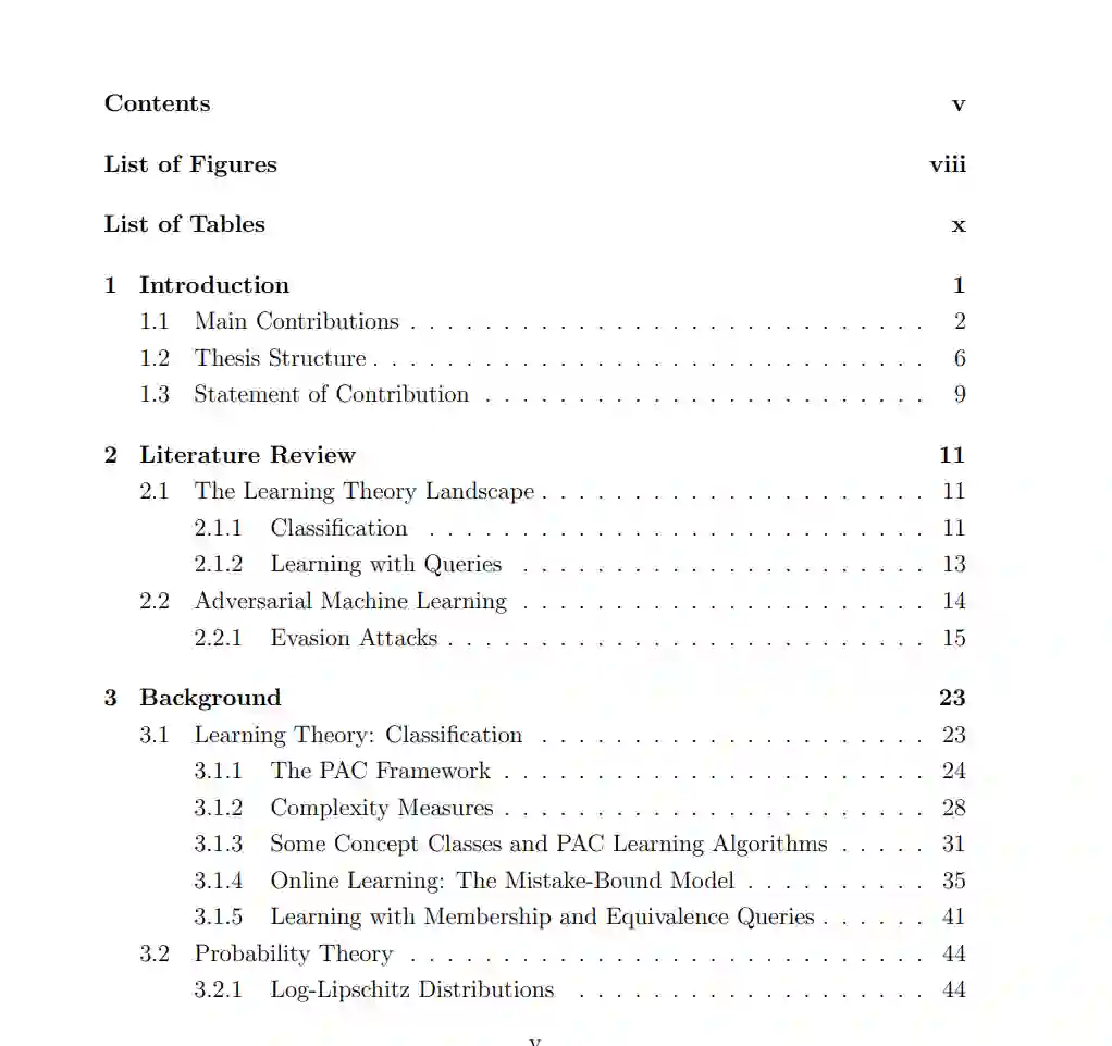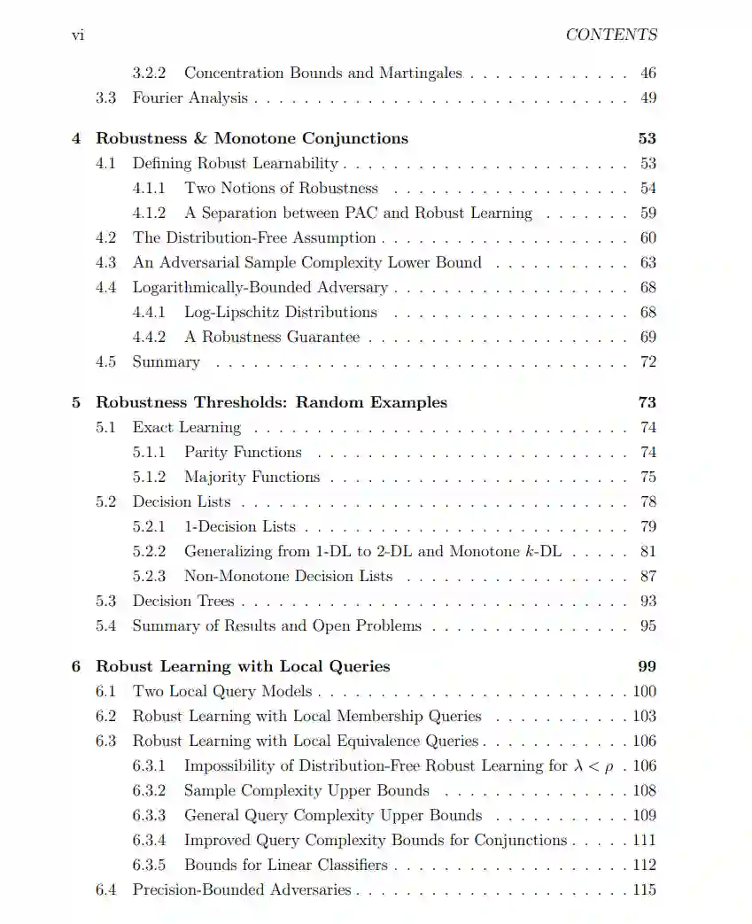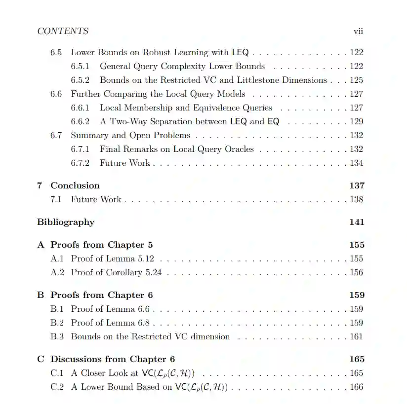 作为第二条途径,我们研究了学习模型,其中学习者通过使用局部查询获得了更多的能力。我们首先考虑的学习模型使用局部成员查询(LMQ),在该模型中,学习者可以查询接近训练样本的点的标签。我们证明,在均匀分布下,即使在学习者除了随机示例外还可以访问LMQ的情况下,对于扰动预算为 O(log n) 的对手,鲁棒学习合取类和任何超类对于对数Lipschitz分布仍然不可避免地需要对对手的预算呈指数依赖。面对这个负面结果,我们引入了局部等价查询预测器,该预测器返回假设和目标概念在训练样本中的某个点周围区域内是否一致,以及如果存在反例的话也会返回反例。我们证明了一个分离结果:一方面,如果查询半径 λ 严格小于对手的扰动预算 ρ,那么在多种概念类别中是不可能进行无分布鲁棒学习的;另一方面,当 λ = ρ 时,我们能够在无分布环境中开发出鲁棒的经验风险最小化算法。然后,我们基于在线学习保证来限制这些算法的查询复杂性,并在合取式特殊情况下进一步改进这些界限。接着,我们提供了一个在 {0, 1} n 上的半空间鲁棒学习算法。最后,由于在 R n 上的半空间查询复杂性是无界的,我们转而考虑具有有界精度的对手,并在这种情况下给出了查询复杂性的上界。