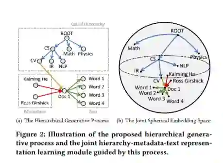 由于层次主题结构在海量文本语料库中普遍存在,将文档分类到给定的标签层次结构直观上很有吸引力。虽然相关研究在全监督层次文档分类方面取得了令人满意的效果,但通常需要大量的人工标注训练数据,且只利用文本信息。但在很多领域,(1)标注代价很高,可以获取的训练样本很少;(2)文档伴随元数据信息。因此,本文研究弱监管下如何整合标签层次结构、元数据和文本信号进行文档分类。我们开发了HiMeCat,一个基于嵌入的生成框架用于我们的任务。具体地说,我们提出了一种新的联合表示学习模块,它允许对类别相关性、元数据信息和文本语义进行同步建模,我们的实验证明了HiMeCat在Baseline上的持续改进,并验证了我们的表示学习和数据增强模块的贡献。