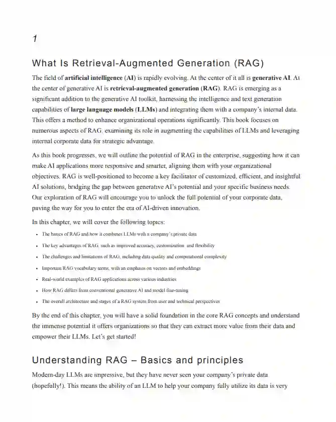 By finelybook 生成式 AI 正在帮助组织以新的方式挖掘数据潜力,检索增强生成(RAG)技术结合了大型语言模型(LLM)与内部数据,从而实现更智能且相关性更高的 AI 应用。本书的作者结合了他十年机器学习的经验,为您提供在使用 RAG 推动变革性成果时所需的战略见解和技术专长。 本书探讨了 RAG 在增强组织运营中的作用,将理论基础与实用技术相结合。您将通过使用 LangChain 和 Chroma 向量数据库等工具的详细代码示例,获得在 AI 系统中集成 RAG 的实践经验。章节中包含了真实的案例研究和示例应用,展示了 RAG 的多种应用场景,包括搜索引擎和聊天机器人。您将学习如何管理向量数据库、优化数据检索、有效的提示工程(prompt engineering)、以及量化性能评估的方法。本书还介绍了将 RAG 与前沿 AI 代理及新兴的非 LLM 技术的高级集成。 通过本书的学习,您将能够在商业场景中成功部署 RAG,解决常见的挑战,并扩展该革命性 AI 技术的潜力。 您将学到的内容