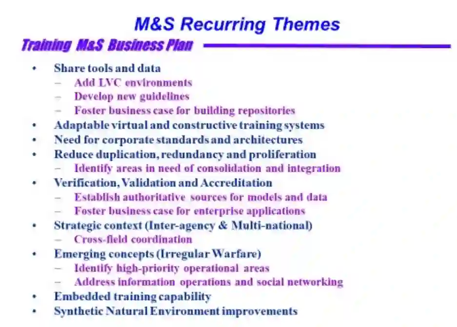 在可预见的未来,建模与仿真(M&S)和相关分析将继续对美国防部(DoD)产生普遍影响。M&S 提供的工具将继续促进国防部未来的作战和训练任务。长期以来,M&S 软件开发取得了长足的进步,这为 M&S 人员的未来发展和企业发展提供了良好的机遇。在过去的 50 年中,将 M&S 作为多种国防应用工具的使用得到了根本性的改善,但数十年来,一些顽固的问题一直困扰着用户。如今,这些问题中的许多都已得到解决,我们可以在整个部门内高效、有效地提供实时环境。过去,这些 M&S 环境的创建耗费了大量的时间和金钱。利用现有技术和新兴技术将有助于降低未来 M&S 系统和应用的技术风险和成本。本文的内容反映了作者亲眼目睹 M&S 发展史的感悟,这段历史跨越了硬件和软件方面的无数创新,使 M&S 应用日臻完善。