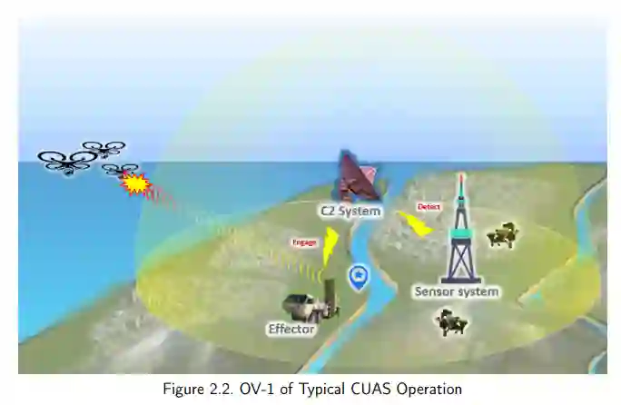各设施迫切需要采用反无人机系统(CUAS)来主动保护其资产和安全。为有效对抗无人机系统,CUAS 需要多个传感器来探测、识别和分类无人机系统,然后再使用拦截器击落无人机系统。然而,CUAS 系统的内部和外部存在多种因素,可能会削弱 CUAS 的有效性,设施指挥官必须采取相应的缓解措施[6]-[8]。设施指挥官面临的一大挑战是如何在与无人机系统的技术竞赛中保持领先。