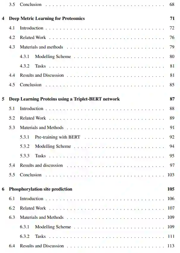 鉴于蛋白质内部的差异性,要有效地总结数据是很困难的,因为有关蛋白质的信息可能会因特征工程而丢失。在本论文的每个研究章节中,通过使用深度学习,我们解决了应用传统机器学习来为蛋白质数据建模的缺点。在第一个技术章节中,我们首先使用了最先进的子词编码方案。我们证明,与标准基线相比,这些新的表征对预训练更有利、更实用。在下一章中,我们更进一步,解决将深度学习模型应用于较小的数据集的问题。在此过程中,我们探讨了如何利用度量学习来形成一个强大的模型架构,该架构能够从少数标记的例子中学习并对蛋白质进行排名。之后,我们考虑了一种同时利用预训练和公因子学习的方法,通过使用大型无监督网络达到新的最先进水平。在这一章中,我们利用在大量蛋白质组学数据上预训练的BERT模型,只用少量的数据对回归任务的集合进行建模。我们采用三重网络结构来为每个数据集微调BERT模型,并评估其在一组下游任务上的表现。所提到的前三个策略在各种下游任务上进行了测试:四个蛋白质特性预测任务(质膜定位、热稳定性、吸收峰值波长、对映选择性)。