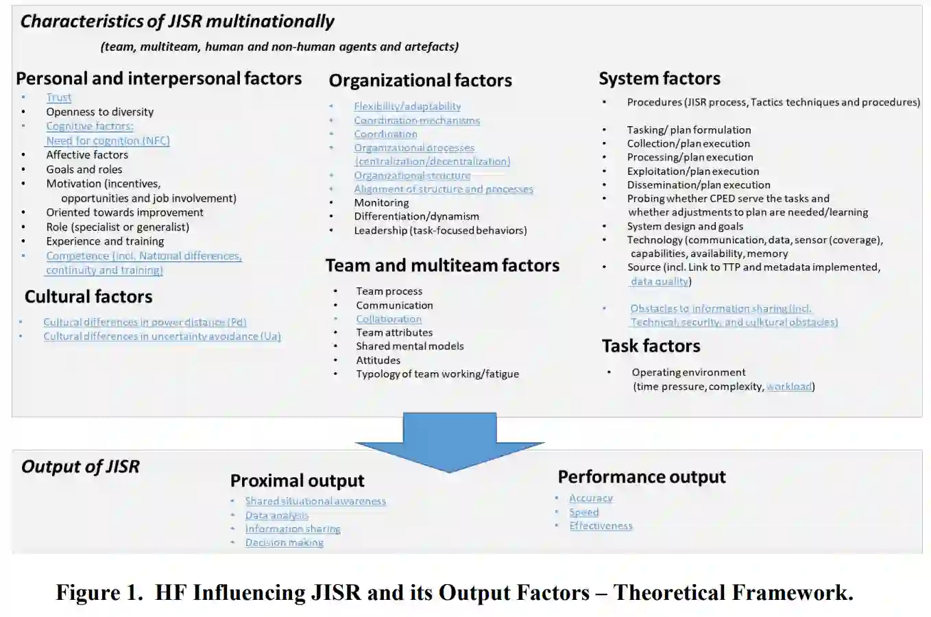 在不同的章节中,我们阐述了个人和人际因素、组织因素、文化因素、任务因素、系统因素和团队因素如何影响联合监委会。这些输入因素预计会影响监委会的程序及其在监委会内部以及向外部组织要素(如联合目标或情报界)提供可用结果的能力,进而影响诸如共享情况意识、数据分析、信息共享和决策以及任务完成的准确性和速度等输出因素。图 1 描绘了输入和输出因素之间的拟议联系;该图概述了本报告研究的所有因素。蓝色和带下划线的因素是经过实证研究的因素。在随后的章节中会有更详细的理论介绍,其中还包括更详细解释一般模型中提出的各因素之间拟议相互关系的模型。