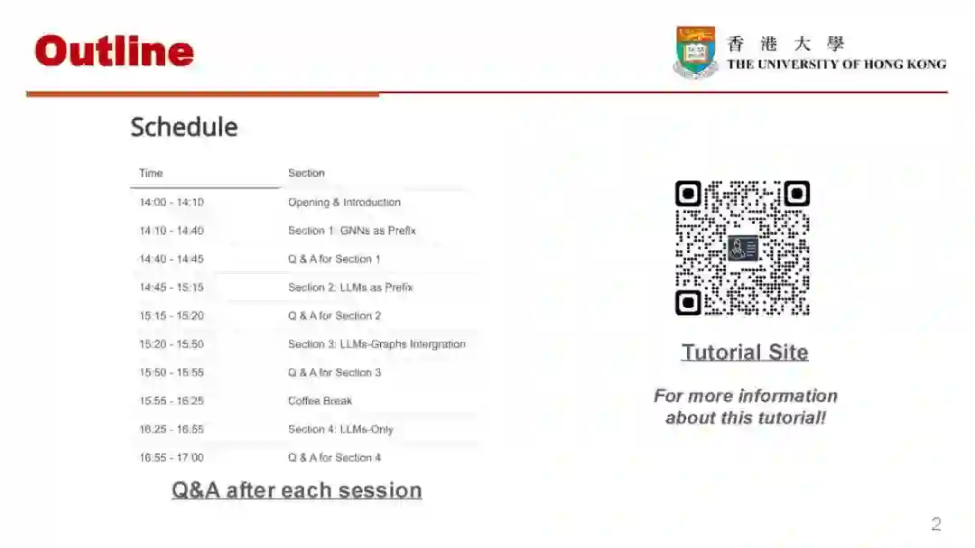 图是一种用于表示现实世界中关系的关键数据结构。先前的研究已经证明,图神经网络(GNNs)在以图为中心的任务中(如链接预测和节点分类)表现出色。尽管取得了这些进展,但数据稀疏性和有限的泛化能力等挑战依然存在。近年来,大规模语言模型(LLMs)在自然语言处理领域引起了广泛关注。它们在语言理解和总结方面表现优异。将LLMs与图学习技术相结合,作为提升图学习任务性能的一种方法,逐渐引起了研究兴趣。我们将探讨利用大规模语言模型(LLMs)在图任务中发挥作用的四类主要方法。这四类方法分别是:i) 图神经网络(GNNs)作为前缀,ii) LLMs作为前缀,iii) LLMs与图的集成,以及iv) 仅使用LLMs。在每个部分中,我们将向您介绍该领域的领先技术,并提供示例代码片段供您实验。本教程旨在为希望开创新的LLM4Graph解决方案的研究人员,以及希望在实际场景中应用这些方法的行业专业人士提供有价值的参考。参考文献: