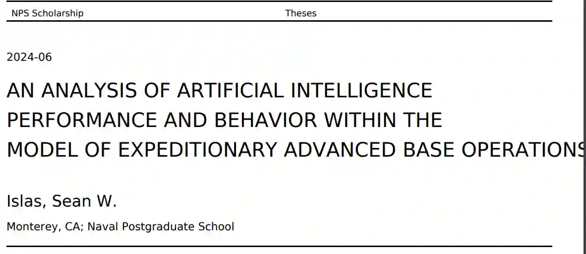 本文旨在分析人工智能(AI)在远征先进基地作战(EABO)中的应用,重点是作战和后勤行动。使用 Atlatl 作为模拟引擎,在模拟待命部队在两栖环境中分布式作战所面临挑战的场景中测试了多个智能体。测试了每种人工智能在军事行动临界值以下开展维持行动的能力,以及在越过临界值时抵御两栖攻击的能力。就脚本智能体而言,事实证明,根据联合作战方法对行为进行调整可创造出生存能力更强的人工智能,同时保持其杀伤力水平。就建立在神经网络基础上的智能体而言,由于问题的规模和范围,其性能受到了限制,可能需要进行更多的研究才能显示出显著的效果。这项研究是继续开发 EABO 概念的探索工具,可为继续完善操作概念提供反馈。