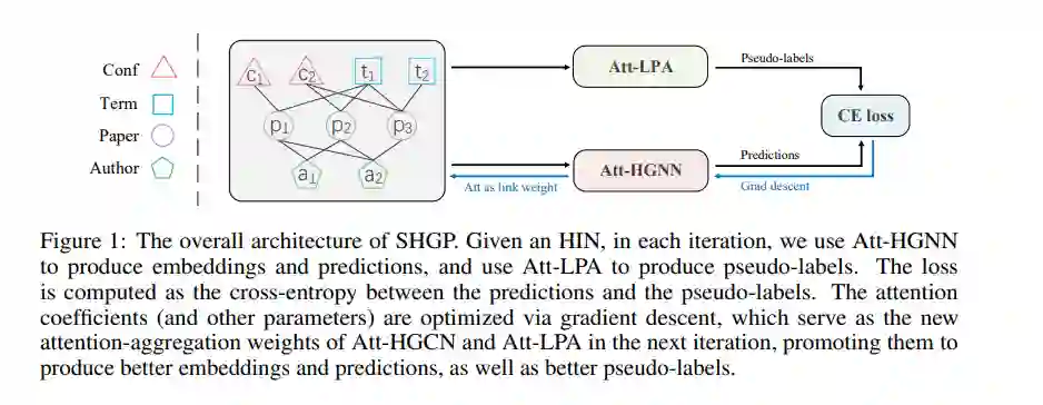 近年来,基于异构信息网络(HINs)的自监督预训练方法与传统的半监督异构图神经网络(HGNNs)相比显示出了良好的竞争力。不幸的是,它们的性能严重依赖于精心定制各种策略,以生成高质量的正例和反例,这明显限制了它们的灵活性和泛化能力。在这项工作中,我们提出了一种新的自监督异构图预训练方法SHGP,它不需要生成任何正例或负例。它由两个共享相同注意力聚合方案的模块组成。在每次迭代中,Att-LPA模块通过结构聚类产生伪标签,这些伪标签作为自我监督信号,指导Att-HGNN模块学习对象嵌入和注意系数。这两个模块可以有效地相互利用和增强,促进模型学习判别嵌入。在四个真实数据集上的大量实验证明了SHGP对最先进的无监督基线甚至半监督基线的优越有效性。我们在https://github.com/kepsail/SHGP发布源代码。