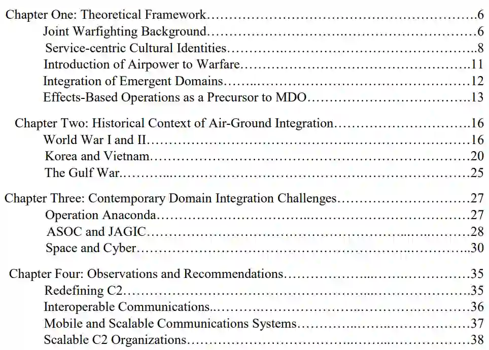 第一章从联合组织与责任、以军种为中心的文化等角度回顾了美国国防部的领域整合理论框架,并对 20 世纪引入空中力量这一挑战进行了研究。第一章还研究了过去联合作战和基于效果的作战(EBO)的方法、面临的困难以及如何为 MDO 提供借鉴。第二章讨论了从第一次和第二次世界大战到 1991 年海湾战争等过去空地一体化的具体实例,并重点介绍了其成功经验和面临的挑战。第三章继续按时间顺序,探讨了 9/11 后全球反恐战争初期 “蟒蛇行动 ”期间一体化所面临的挑战,同时研究了当代 ASOC、其当前的条令组织以及在新的 JAGIC 框架内的作用。第三章还概述了美军最近如何寻求整合太空和网络这两个新兴领域。最后,第四章总结了前几章的内容,并借鉴其中的轶事,就空军如何整合其所有领域职责以支持地面部队提出了意见和建议。