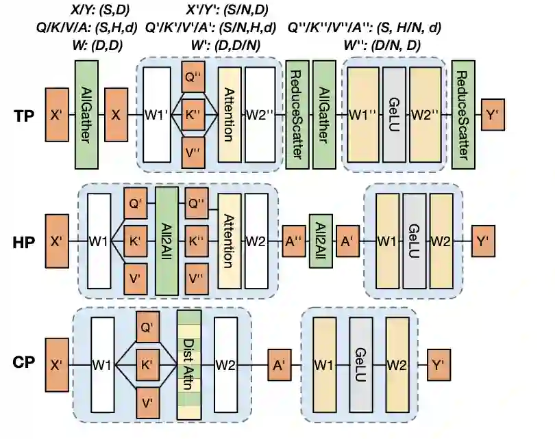 张量并行通过在设备间分割两个连续的矩阵乘法来并行化计算。这种方式可以减少内存开销,因为每个设备只需存储部分权重和激活值。然而,它会产生大量通信开销,用于汇总矩阵乘法的结果,并且由于通信和计算之间存在强依赖关系,因此在通信和计算重叠能力方面比其他方法更差。 具体地,以Transformer举例,张量并行将以两种方式对线性层权重矩阵进行切分:行切分和列切分,分别对应于输入和输出的维度。首先每个设备上只有一个子序列的输入,在计算Attention的Q,K,V 全连接层映射时,对输入进行一个All-Gather操作,使得每个设备得到完整的输入,随后和做了行切分的Q, K, V线性层权重进行矩阵乘,而在Attetnion的输出层, 则对应需要进行一个ReduceScatter对结果进行累加。对于前馈网络部分,和Attention类似,第一全连接层的输入也需要进行All-Gather操作,而第二全连接层的输出则需要进行ReduceScatter操作。