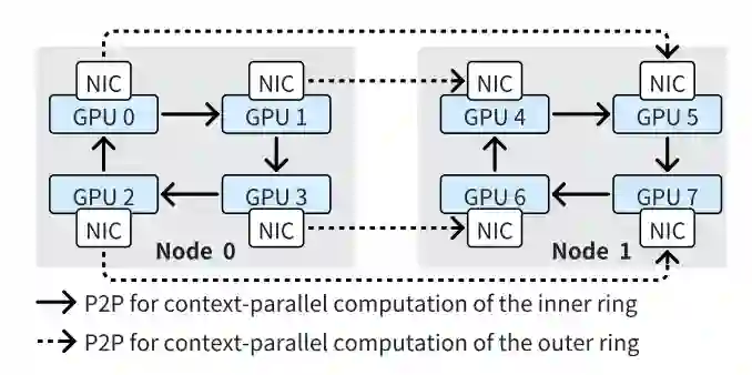 图2 RingAttention多环通信 具体地,最近的工作LoongTrain[10]提出了DoubleRing的通信模式,通过将原本RingAttention的全局通信环根据通信拓扑拆分成多个,环之间通过数据交换从而确保原本的全局通信环的通信结果。这样做的主要优势在于,现在的高性能计算集群,GPU往往和网卡连在一个PCIe Switch上以确保GPU之间的跨网络通信不再需要经过CPU,而是直接通过PCIe Switch进行数据交换,即所谓的GPUDirect技术。当一台机器上有多个GPU时,也就对应拥有多张网卡,DoubleRing的通信模式可以充分利用这些网卡,从而提高通信效率,因为在一整个环的通信过程中,通信的瓶颈在于相邻GPU之间的网络通信,而DoubleRing的通信模式可以将这些通信瓶颈分散到多个环中,并将环间通信和环内通信进行异步, 从而提高通信效率。