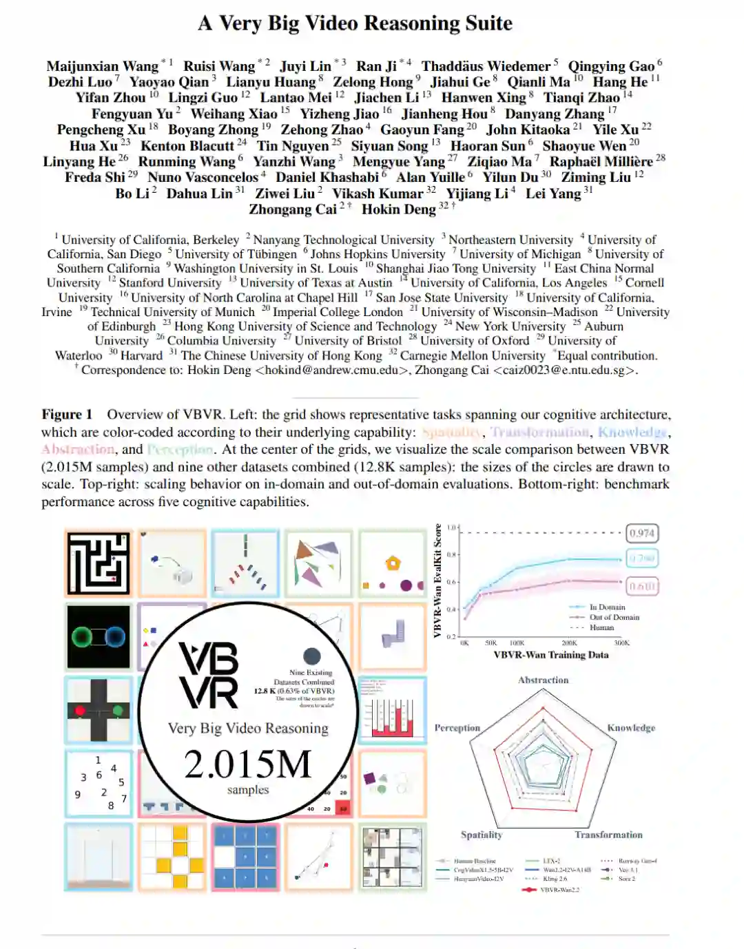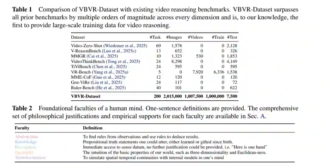 大语言模型(LLMs)已取得突破性进展,其推理能力已泛化至编程、数学及科学发现等极具挑战性的任务中 (Mitchell, 2025; Rapaport, 2026)。然而,此类能力目前很大程度上仍局限于文本场景。与此同时,视频生成模型的近期进展主要集中在视觉真实感(Visual Realism)上,对其推理能力的关注相对有限。然而,视频模型有望支撑一种全新的推理范式 (Wiedemer et al., 2025),即植根于时空一致(Spatiotemporally Consistent)的视觉环境中,其中空间结构、物理动力学及远距离因果关系被自然地编码。这使得视频帧成为研究植根于物理世界的推理能力的理想基质。尽管前景广阔且研究兴趣日益增长,但社区仍缺乏实现系统性进展的关键组件:(1) 用于深入研究缩放效应(Scaling)与泛化性的大规模多样化数据集;(2) 基于可验证且可复现原则构建的评估工具链;(3) 考察视频推理模型中涌现能力(Emergent Capabilities)的初步缩放研究。本文通过推出 Very Big Video Reasoning (VBVR) 套件,一次性解决了上述三大挑战。 首先,我们介绍了 VBVR-Dataset,这是一个旨在促进视频推理系统研究的大规模多样化训练源。我们采用规范化方法,将任务分类体系(Taxonomy)锚定在公认的人类认知架构理论之上 (Newell & Simon, 1972; Anderson, 2007)。具体而言,我们将核心视觉推理能力组织为五大支柱:抽象 (Abstraction)、知识 (Knowledge)、空间性 (Spatiality)、知觉 (Perception) 与变换 (Transformation)。该数据集是全球超过 50 位来自不同领域的科研人员与工程师通力合作的成果,确保了目前已涵盖的 200 项任务具有广泛的覆盖面和深厚的领域专业性。贡献者被赋予充分的自由来设计核心任务语义和推理流程,以实现最大限度的多样化;同时,我们应用统一的全局任务模板作为输入输出规范的标准化包装器。这种分离机制在不限制任务创造力的前提下,确保了自动化缩放的一致性。所有任务在进入基于云端的自动化分布式生成流水线之前,均经过专家人工检查以确保质量与准确性。总计,VBVR-Dataset 包含 2,015,000 张图像和 1,007,500 个视频剪辑,规模约为现有同类数据集的 1,000 倍。重要的是,该流水线可立即兼容新加入的任务,并支持每项任务样本量的可扩展生成,从而实现数据集广度与规模的持续扩张。 其次,VBVR-Bench 为视频推理模型提供了一个系统、可复现且具解释性的评估框架。尽管“视听语言模型评判(VLM-as-a-judge)”范式在评估视频生成模型中被广泛采用 (Peng et al., 2025),但我们明确强制使用可验证的、基于规则的评分器,以确保评估结果定义清晰且完全可复现。为了验证这些特定任务评分器能忠实反映模型能力,我们进行了人类偏好对齐实验,观察到自动评分与人工判断之间存在极强的一致性(斯皮尔曼相关系数 $\rho > 0.9$)。利用 VBVR-Bench,我们对领先的商业模型——Veo 3.1 (Google DeepMind, 2026)、Sora 2 (OpenAI, 2025)、Kling 2.6 (快手, 2025) 和 Runway Gen-4 (Runway Research, 2025)——以及包括 Wan-2.2 (万像团队, 2025)、CogVideoX1.5 (Yang et al., 2024)、HunyuanVideo (腾讯混元, 2024) 和 LTX-2 (HaCohen et al., 2026) 在内的代表性开源模型进行了基准测试。结果显示,不同系统之间的视频推理能力存在巨大差距;即便最强的模型距离人类水平仍有显著差距。此外,我们利用 VBVR 分析了不同认知能力在模型中是如何协同演进的,揭示了推理技能之间非平凡(Non-trivial)的依赖关系与权衡。 最后,在拥有大规模数据集和可靠评估基准的基础上,我们深入探讨了视频生成模型中的缩放效应(Scaling Effects)。以 Wan-2.2 为基座模型,我们观察到随着训练规模的扩大,域内(ID)和域外(OOD)任务的性能均同步提升,这表明泛化能力正在逐渐涌现。除性能提升外,我们的分析还得出几项关键洞察:第一,随着数据规模的增加,ID 和 OOD 任务的性能最终都会进入平台期,模型与人类表现之间仍存在无法单纯通过数据缩放来弥合的持久差距。这表明目前的视频生成架构在应用于视频推理时存在根本性局限。第二,尽管 OOD 性能随规模显著提升,但 ID 与 OOD 设置之间仍存在一致的差距;缩小这一差距对于实现鲁棒的、真实场景(In-the-wild)下的视频推理与生成至关重要。最后,定性分析揭示了随着模型规模增加,在指令遵循、受控编辑和语义理解方面出现的涌现行为,同时也暴露了驱动未来研究的重要局限性。 总之,我们推出了以规模空前且持续增长的视频推理数据集 VBVR-Dataset 为核心的 VBVR 套件,并辅以可验证、符合人类直觉的评估工具包 VBVR-Bench。依托该套件,我们完成了首批关于视频推理模型的系统性缩放研究,并发现了涌现泛化性的早期积极证据。我们认为,VBVR 为迈向通用视频推理的未来研究提供了基础性的基础设施。