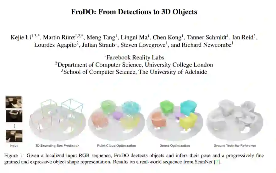 面向对象的映射对于场景理解非常重要,因为它们共同捕获几何和语义,允许对对象进行单独的实例化和有意义的推理。我们介绍了FroDO,这是一种从RGB视频中精确重建物体实例的方法,它以一种由粗到细的方式推断出物体的位置、姿态和形状。FroDO的关键是将对象形状嵌入到一个新的学习空间中,允许在稀疏点云和稠密DeepSDF解码之间进行无缝切换。给定一个局部的RGB帧的输入序列,FroDO首先聚合2D检测,为每个对象实例化一个分类感知的3D包围框。在利用稀疏和稠密形状表示进一步优化形状和姿态之前,使用编码器网络对形状代码进行回归。优化使用多视图几何,光度和剪影损失。我们对真实世界的数据集进行评估,包括Pix3D、Redwood-OS和ScanNet,用于单视图、多视图和多对象重建。