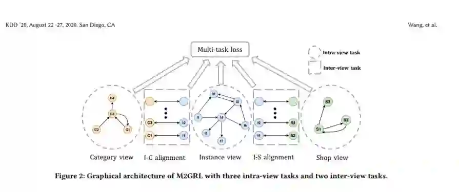 将图表示学习与多视图数据(边信息)相结合进行推荐是行业发展的趋势。现有的方法大多可以归类为多视图表示融合;他们首先构建一个图,然后将多视图数据集成到图中每个节点的一个紧凑表示中。然而,这些方法在工程和算法方面都引起了关注:1)多视图数据在工业中是丰富的,信息量大,可能超过单个向量的容量,2)由于多视图数据往往来自不同的分布,可能会引入归纳偏差。在本文中,我们使用一种多视图表示对齐方法来解决这个问题。特别地,我们提出了一个多任务多视图图表示学习框架(M2GRL)来学习网络规模推荐系统的多视图图的节点表示。M2GRL为每个单视图数据构造一个图,从多个图中学习多个单独的表示,并对跨视图关系进行对齐。M2GRL选择多任务学习范式,共同学习视图内表示和跨视图关系。此外,M2GRL利用同方差不确定性自适应调整训练任务的权重损失。我们在淘宝上部署了M2GRL,并在570亿个例子上训练它。根据离线指标和在线A/B测试,M2GRL的性能显著优于其他最先进的算法。淘宝多样性推荐的进一步探索表明了利用所产生的多种表示的有效性,我们认为这对于不同焦点的行业推荐任务是一个很有前景的方向。