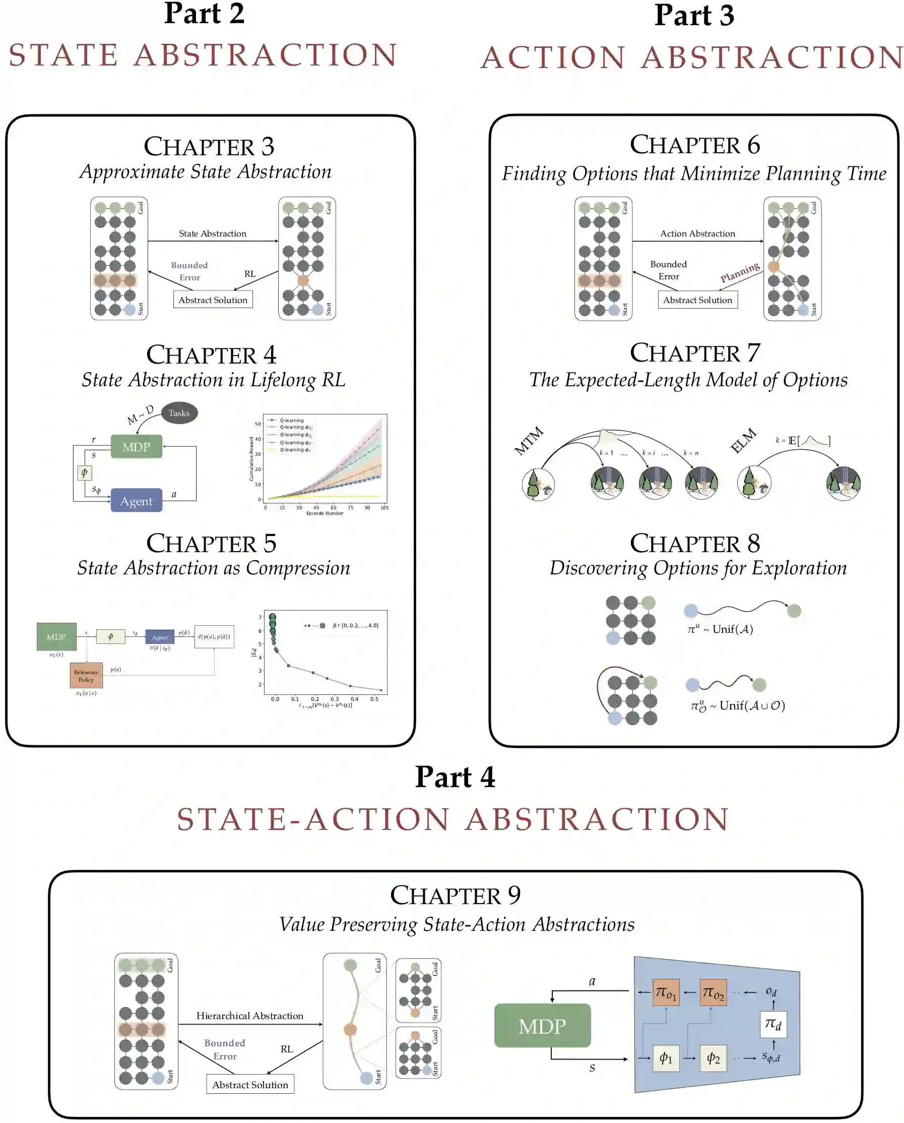 第4部分。最后,我转向状态动作抽象的联合过程。在第9章中,我介绍了一个将状态和动作抽象结合在一起的简单机制。使用这个方案,然后我证明了哪些状态和动作抽象的组合可以在任何有限的MDP中保持良好的行为策略的表示,定理9.1总结了这一点。接下来,我将研究这些联合抽象的反复应用,作为构建分层抽象的机制。在对层次结构和底层状态动作抽象的温和假设下,我证明了这些层次结构也可以保持全局近最优行为策略的表示,如定理9.3所述。然后,我将在第十章中总结我的思考和今后的方向。
