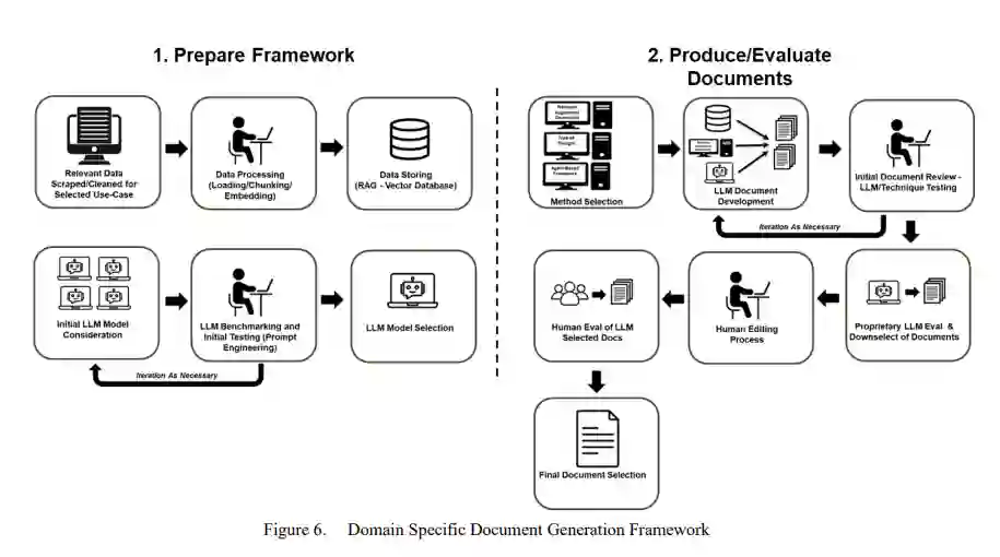 近年来,大型语言模型(LLM)的发展和普及已对社会多个部门产生显著影响。美国军方认为应立即采纳并试验这一新兴技术,以通过更高效的工作流程满足日益增长的作战需求,保持对近似同级对手的技术优势,并发现其局限性和脆弱性,这一点至关重要。本文开发了一个端到端的框架,涵盖从LLM选择到文档评估的领域特定文档生成。我们开发的领域特定文档生成框架融合了多种技术,包括提示工程(PE)、检索增强生成(RAG)、一种代理式方法以及一种LLM作为评估器的方法。为了验证该框架,我们选择了一个"战争路径推演"(road-to-war)文档作为测试用例,该文档通常用作国防部(DoD)兵棋推演、作战、训练和分析界进行想定开发的起点。使用此框架,能够生成看似合理的领域特定文档,这些文档经专家验证具有实用性,并且与人类生成的示例文档没有显著区别。我们的研究表明,LLM可以增强针对文本生成任务的领域特定工作流程,并且通过利用这项快速发展的技术可以实现显著的时间节省。