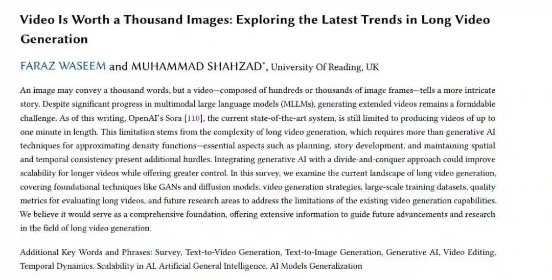 尽管多模态大型语言模型(MLLMs)取得了显著进展,生成长视频仍然是一个艰巨的挑战。截至本文撰写时,OpenAI 的 Sora [110],当前的最先进系统,仍然仅限于生成最长为一分钟的视频。这一限制源于长视频生成的复杂性,生成长视频不仅仅需要生成 AI 技术来逼近密度函数,还需要解决诸如规划、故事发展以及保持空间和时间一致性等关键问题,这些问题增加了额外的难度。将生成 AI 与分而治之的方法相结合,能够提高生成更长视频的可扩展性,同时提供更大的控制力。在本综述中,我们审视了长视频生成的当前研究现状,涵盖了基础技术,如生成对抗网络(GANs)和扩散模型、视频生成策略、大规模训练数据集、长视频评估的质量指标以及未来研究方向,以解决现有视频生成能力的局限性。我们相信,这将作为一个全面的基础,为未来长视频生成领域的进展和研究提供丰富的信息。