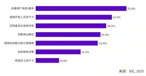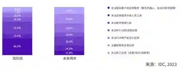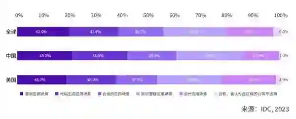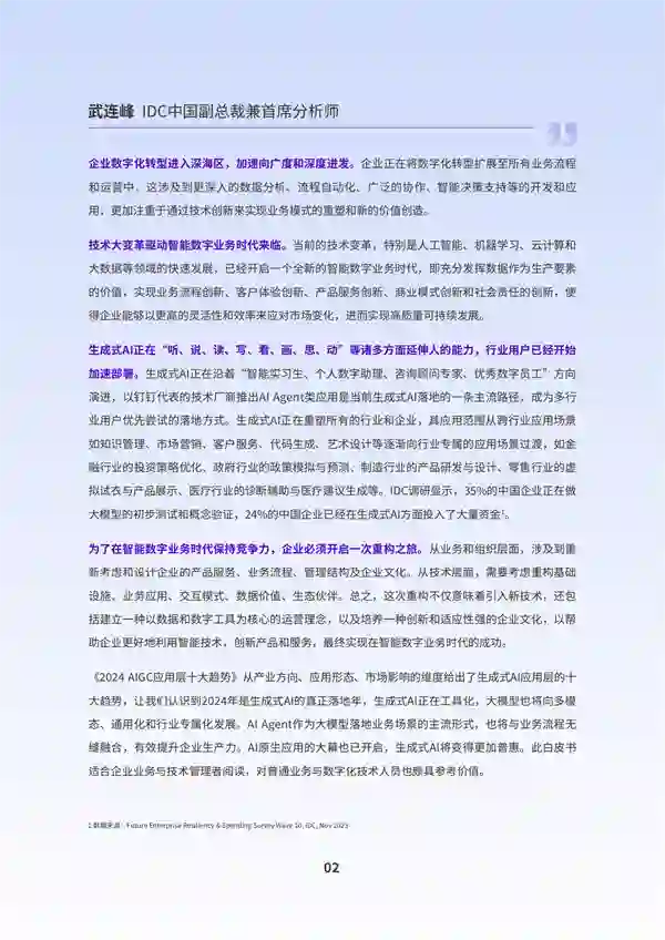 ** 趋势一:围绕AIGC的应用层创新具有确定性,将成就一批创企** IDC认为,2024年,AIGC必然会通过应用创新过程融入到企业业务中,并构建出大量的新场景;同时,AIGC也会借助应用价值链的延伸,改变行业运行业态,对商业模式和利益格局产生深远影响。 因此,围绕AIGC的应用层创新将成就一大批未来创新型企业,应用层创新将成为2024 AIGC产业发展的确定方向。 IDC就AIGC应用对诸多行业用户展开调研,所有受访企业均表示或多或少都开始了对AIGC相关应用的投入与尝试。 一方面,在即将到来的通用人工智能时代,智能化应用将出现爆发式增长的态势,无处不在的应用开发有助于企业以业务场景为切入点快速满足智能创新需求。 IDC预测,到2024年,数字经济的发展将在全球范围内孕育出超过5亿个新应用,相当于过去40年间出现的应用数量的总和。 另一方面,随着通用智能化能力的实践推广,AIGC会优先在企业端用户中实现场景的落地,企业首先考虑的将会是与生产力和办公相关的场景。 与此相对应地,面向消费端用户推出的AIGC应用往往结合着对商业模式的探索和对市场教育的投入,这会延长其构建商业闭环的时间周期。 对于一大批AI技术实践的创新型企业而言,找准落地场景是发挥AIGC实践价值的重要前提。从技术角度来看,AIGC擅长管理广泛的数据资产和知识沉淀,因此在一些先发场景中具备确定性的优势。 IDC一项针对全球企业的调研结果显示,知识管理场景是AIGC现在最受组织青睐的应用场景,在搜索、地图、数字人、智能对话、推荐以及业务流程优化等场景中表现出巨大的潜力。** 趋势二:AIGC正在工具化,从“赶时髦”变“真有用”** 随着大模型的快速迭代成熟,许多行业开始期望大模型能够解决现实问题,带来可持续价值。 IDC调研结果显示,当前企业就AIGC项目择选供应商合作时,最看重的是项目能否在短期内为企业带来价值。在这样的目标指引下,越来越多的未来场景被描绘出来,大模型应用厂商也在积极开拓行业用户,试图快速打造优质客户的行业领先实践。 从个人视角看,AIGC正在工具化,而掌握优秀工具的员工将事半功倍,未来对不同环节工作效率的固有认知与评价标准也会有较为明显的改变。 IDC的调研显示,企业当前最希望通过AIGC来实现的商业目标包括:改善客户体验/服务、提高开发人员生产力、实现差异化竞争优势以及创新商业模式等。 IDC预测,到2026年,AIGC将承担42%的传统营销琐事,如搜索引擎优化、内容和网站优化、客户数据分析、细分、潜在客户评分和超个性化等。