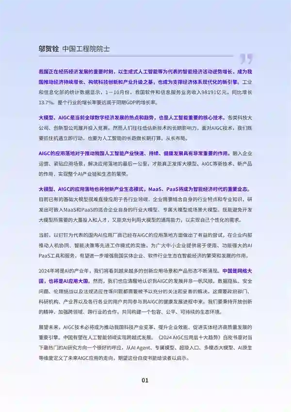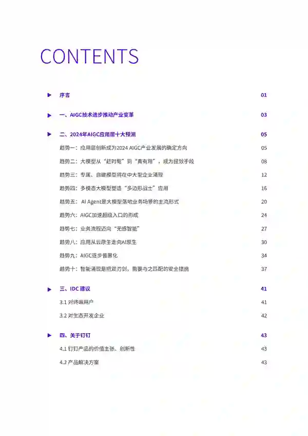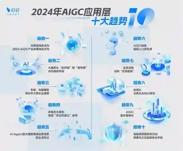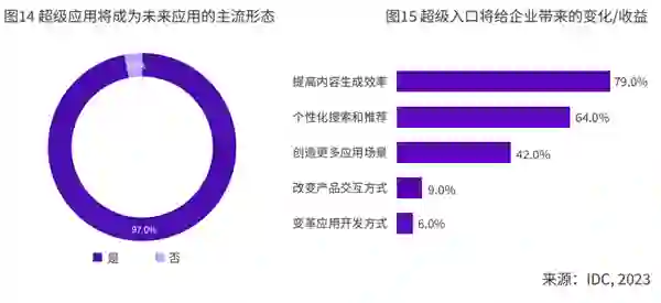 另外,IDC认为,在以AI Agent为代表的AIGC应用加持下,越来越多的创新将会源自于超级个体和小型组织。在一些领域里,一个人加上足够的AI工具,就可以成为一家专业化的公司。 人与AI将产生高效的分工与协作——AI汇集和处理海量需求信息,人只需要在一些关键的节点做出决策和处置动作,即可完成企业价值创造的全过程。** 趋势六:AIGC加速超级入口形成,“No APP”将重塑应用** IDC预测,AIGC将给应用软件的形态和业态带来颠覆性变化—— 基于自然语言的极简交互将替代很多传统的图形界面交互,形成对话式交互模式(LUI)+图形用户界面(GUI)的混合形态;同时,“No APP”的理念也将重塑下一代应用,通过对话即可直接调取、使用各种工具,让更多的非软件专业人员也能获取到强大的系统服务。 由此,超级入口将成为新一代应用软件的典型前端形态。IDC调研显示,绝大多数软件企业都认可超级入口将成为未来的主流应用形态。 IDC认为,AIGC重塑应用形态的过程将重点体现在两个方面:一是对即有软件进行智能化改造与升级,以API的形式增加重要环节的可交互性和认知能力;二是对软件的应用架构和模式进行全新重构。同时,“No APP”的理念将会体现在大量的未来应用中。 从应用软件侧来看,基于严格的功能菜单选项的方式将逐渐淡出,应用功能将被碎片化的融入到超级应用中,实现原子功能的灵活调取和组合。 IDC同时指出,AIGC带来的应用形态变革,也有利于激发当前的软件产业活力,促进软件生态繁荣,推动应用与垂类业务实现更深的融合。** 趋势七:AI能力更加原子化,业务流程迈向“无感智能”** 身在畜禽行业的四川铁骑力士实业有限公司,面对来自外部客户的知识咨询需要和企业内的培训需求,选择与钉钉合作共创,实现了利用智能化技术高效能地应对。 在此类问答类场景里,用文档的数据“喂”模型时,窗口界面对文档的大小有限制,需要采取切片的方式,让模型能一段一段去做阅读理解。 在此案例中,原子化的AI能力以细粒度的方式作用到业务流程的诸多环节中,以“无感智能”的形态,成为企业运营过程中必不可少的组成部分。 IDC调研结果显示:AI与应用融合逐步分散且深入的融合,体现在企业运营与业务流程的各个方面。