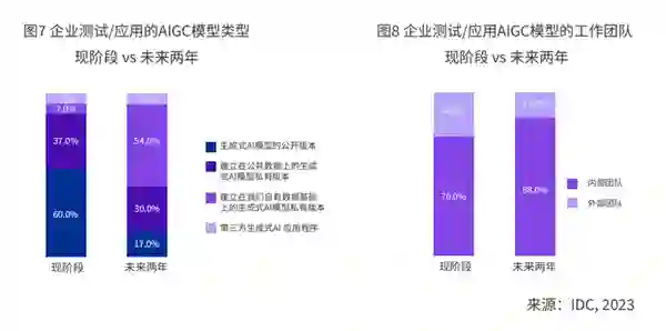 但与此同时,IDC调研也表明,企业高层普遍担心AIGC带来的运营成本不可预测、隐私/合规风险以及客户预期管理等有关的不可控局面。此外,相关的技术栈、工具软件、数据集、技能方面的缺失都可能限制企业对AIGC的投入热情。 因此,大模型的安全可解释以及产品工具的易用性都非常重要,是坚定企业信心、加快场景落地的关键。IDC认为,企业可基于AI PaaS,快速、低门槛地搭建起专属的智能化应用。 例如,阿里钉钉2023年推出了面向生态伙伴和企业的智能化底座AI PaaS,下接大模型能力,上接用户真实需求,能让大模型的能力进入工作场景并稳定输出。** 趋势三:专属、自建模型将率先在中大型企业涌现** 企业或组织对于大模型的要求不仅仅是实现“通识”,更需要其成为特定领域的“最强大脑”。 因此,企业客户会产生越来越多的专属、自建模型需求,特别是一些中大型企业,通过对大模型的领域化适配,有望获得更加理想的综合收益。 IDC的调研显示:目前有60%的企业使用大模型的公开版本,但2年后会迅速降至17%,而更多的企业会将AI应用建立在私有、专属模型基础上;同时,高达88%的企业选择通过内部团队开发相关应用。 由此可见,行业专属大模型已经成为企业未来的热点目标,企业也要持续建设自己人才队伍,修炼AIGC应用的“内功”。