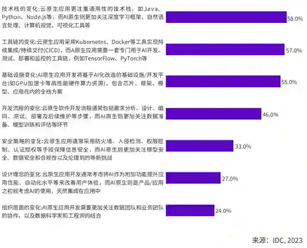 通过自动化、数据驱动的决策支持、创新加速等方式,AIGC有望实现对业务流程的持续提质增效。 IDC认为,AI与业务的融合进程将在未来几年达到前所未有的高度。AIGC给业务流程带来的智能革新,一方面打开了新的需求空间,产生了规模化的流程重组效应,同时也可能让传统行业多年来一成不变的业务规则转变为持续迭代的态势。 在此基础上,AIGC将使工作人员投入更高价值的创新活动,从而释放出更强大的核心生产力。 IDC预测,到2028年,由于效率提升,中国的开发人员投入到创新工作的时间将大幅提升,由原来仅占开发时间的20%提高到50%。** 趋势八:应用从云原生走向AI原生,软件可望“以天为单位”开发** 随着大模型和AIGC的发展,应用正在从“+AI”向“AI+”转变,AI定义场景成为新范式。 在向行业纵深的进程中,AI产品不应仅被视为模型能力的搬运工,而更应该由行业用户带着痛点寻求AI+解决方案,即从方案设计初始就开始思考AI的融入,贯穿于业务应用的全生命周期中。 IDC预测,到2025年,70%的企业将与云供应商就生成式人工智能平台、开发人员工具和基础设施建立战略联系。可见,在迈向AI原生的过程中,企业正积极做着准备。