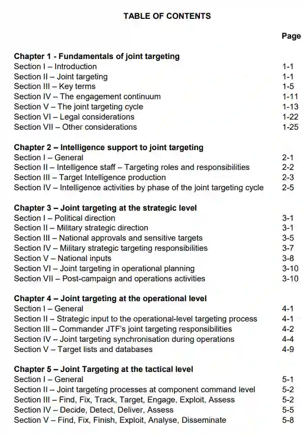 盟军联合出版物(AJP)-3.9(B)盟军联合目标选择理论描述了联合目标选择过程中固有的政治/军事战略指导和监督的作用、责任、程序和产品,作战级指挥部的联合目标选择,以及组成部分指挥级的目标选择。本文件概述的程序不适用于近距离作战、非常规手段,也不限制通过使用国际法、国家法律和政策规定的必要和相称的武力,包括致命武力,来保护人员不受交战或即将发生的交战影响,行使自卫权。由于北约的组织变化,目标选择是由联合效应职能部门负责,由欧洲盟国最高总部的联合效应处(JTE)管理。