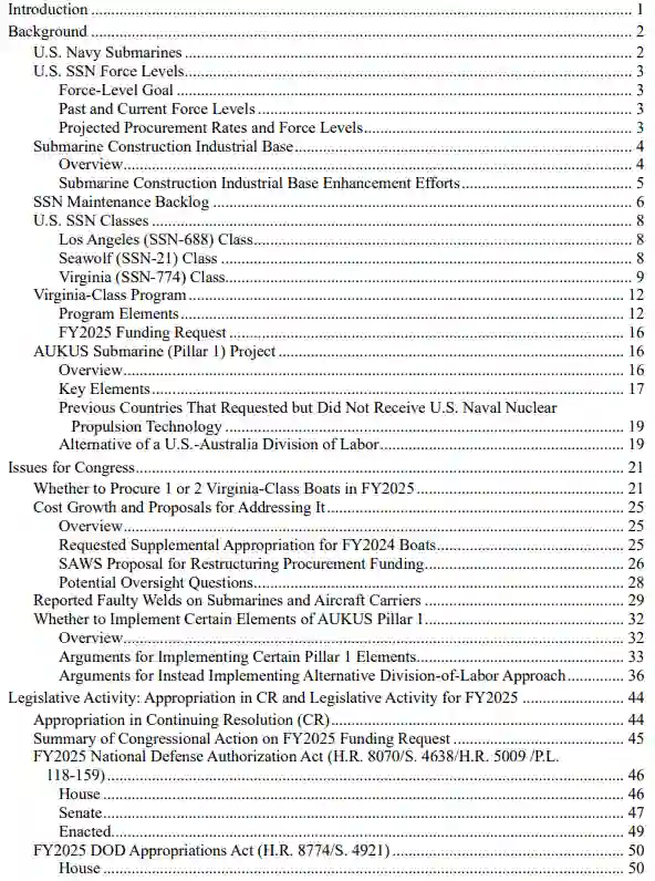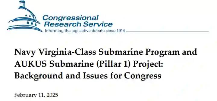 AUKUS潜艇(支柱1)项目。2021年9月,澳英美三国政府宣布建立名为AUKUS的重大新安全伙伴关系。AUKUS支柱1项目包括:(1) 在西澳大利亚某港口轮换部署四艘美国SSN和一艘英国SSN;(2) 更具实质意义的是,向澳大利亚出售三到五艘弗吉尼亚级SSN,随后为美国海军建造三到五艘替代SSN;(3) 美英协助澳大利亚建造三到五艘新型英澳联合设计的SSN,以完成澳大利亚计划组建的八艘SSN舰队。作为2024财年国防授权法案(NDAA)(H.R. 2670/P.L. 118-31,2023年12月22日生效)审议的一部分,国会已批准支柱1项目的授权立法。实施(2)和(3)的潜在收益、成本及风险,可与另一种方案的潜在效益进行对比:该替代方案拟额外采购最多八艘弗吉尼亚级SSN,这些潜艇将保留在美国海军序列中,与根据(1)计划部署至澳大利亚的美英SSN共同在澳运作。