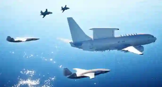 图:澳大利亚皇家空军E-7A"楔尾"预警机由MQ-28"幽灵蝙蝠"僚机编队指挥/护航的效果图。[波音公司]