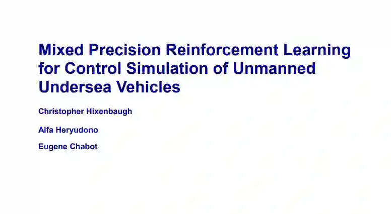 本研究将证明在混合精度和损失比例的情况下,训练DDPG代理对UUV的连续控制不会影响控制系统的性能,同时在两个方面使解决方案的计算效率更高。首先,我们将比较用固定和混合数值精度训练的DDPG代理的性能与1自由度速度控制问题的PID控制器的性能。我们将研究用固定和混合精度训练DDPG代理的训练步骤时间。其次,本研究将研究DNN大小和批量大小的阈值,在此阈值下,用混合精度训练DDPG代理的好处超过了计算成本。