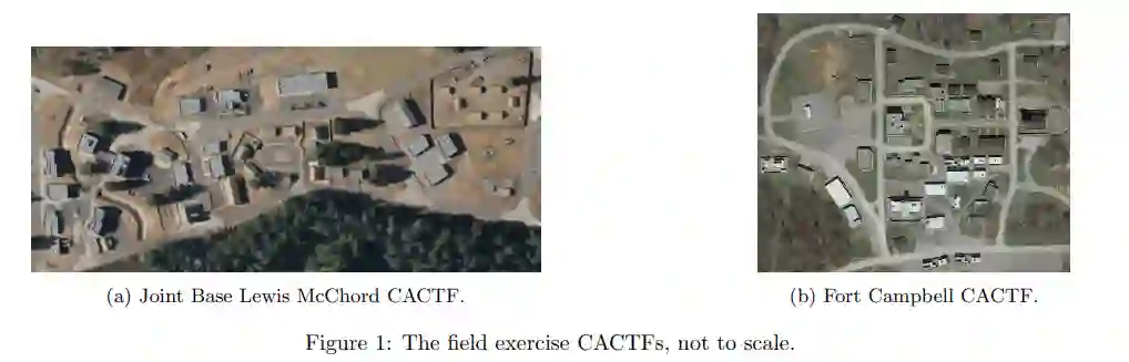 对两个 CACTF 进行了分析。图 1a 所示的刘易斯-麦克乔德联合基地莱斯奇镇是第 4 次实地演习(FX)的地点,最初被考虑用于第 6 次实地演习。最终,坎贝尔堡的卡西迪 CACTF(如图 1b 所示)被选为 FX6 的地点。本手稿对实际任务和模拟任务进行了分析,模拟任务的结果是 FX6 实际结果的基线。潜在的拥堵对无人机的飞行时间及其对实现任务方案目标的贡献影响更大;因此,CCAST 蜂群的无人机是本分析的主要重点。