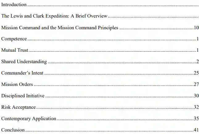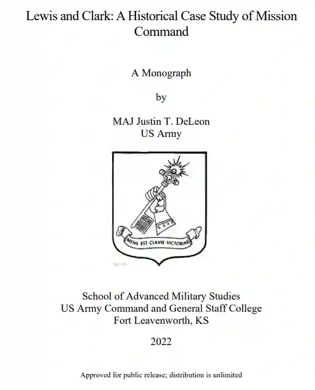 虽然刘易斯和克拉克远征发生在向大规模作战行动过渡之前很久,但它可能有助于说明如何在退化或被拒绝的环境中正确运用任务式指挥原则。此外,它还提供了一个案例研究,说明领导者如何在评估和理解总体战略影响的同时做出困难的战术决策。本专著认为,梅里韦瑟-刘易斯、威廉-克拉克和托马斯-杰斐逊有效地利用了今天所谓的任务式指挥原则。此外,它还提出,刘易斯和克拉克探险可以为当代运用七项任务式指挥原则提供启示。
