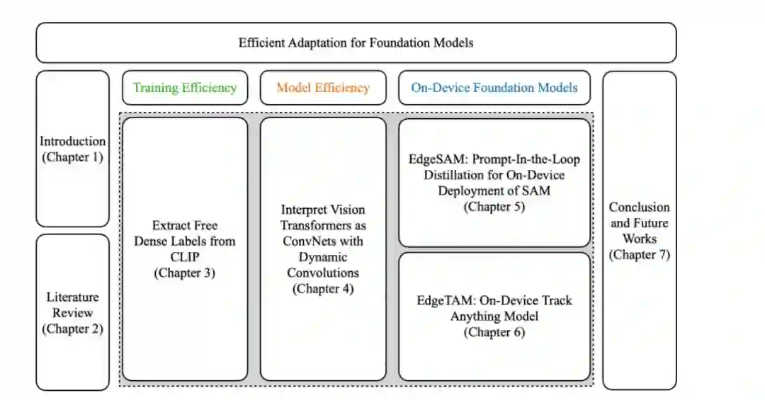 最后,为实现部署效率,我们开发了 EdgeSAM 和 EdgeTAM。通过架构重构与任务感知蒸馏(Task-aware distillation),我们将大型分割基础模型 [2, 3] 蒸馏为适用于移动端和边缘设备实时推理的轻量化变体。这些模型在大幅降低延迟和内存占用的同时,保留了其大型对应模型所具备的交互式与通用化能力。 在多个基准测试上的广泛实验表明,所提方法有效降低了标注成本,提升了计算效率,并使基础模型在设备端的实际部署成为可能。综上所述,这些贡献推动了基础模型在现实世界计算机视觉应用中的高效适配与部署。