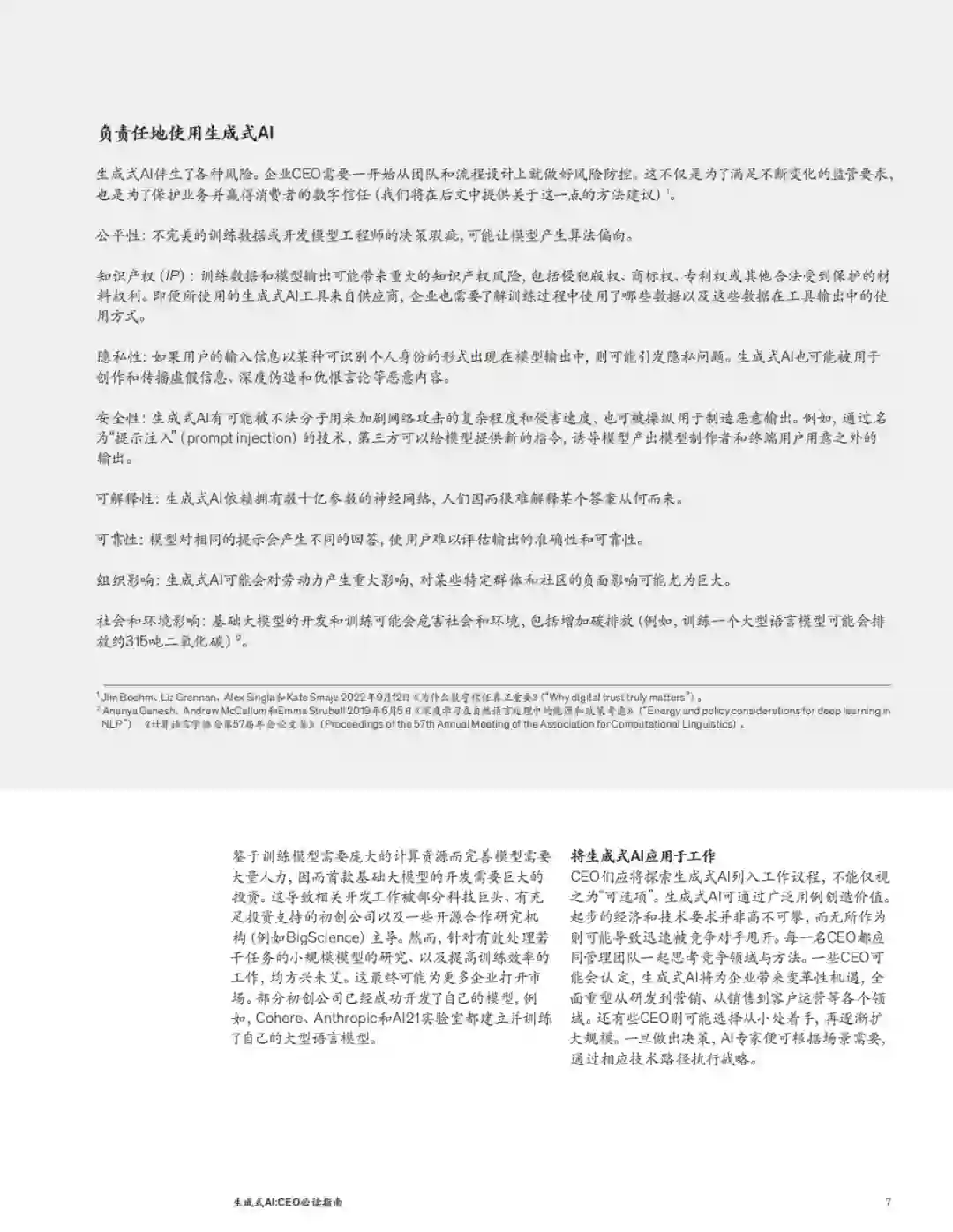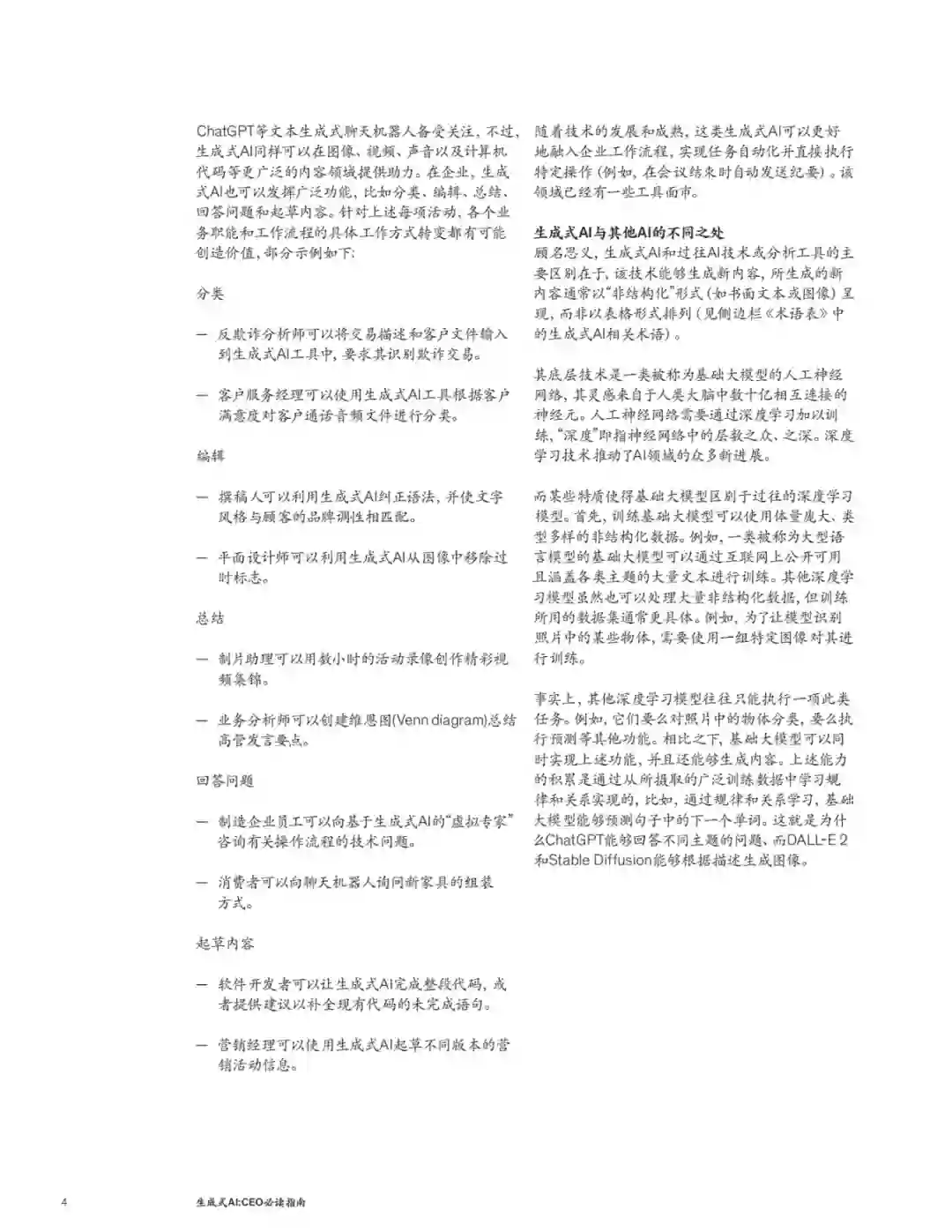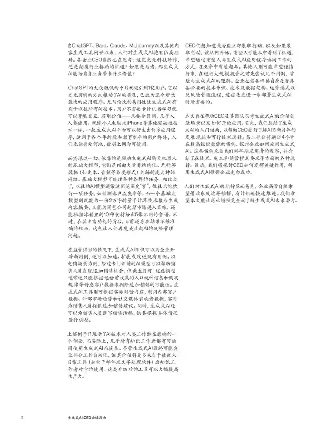 自ChatGPT、Bard、Claude、Midjourney以及其他内 容生成工具问世以来,人们对生成式AI抱有很高期 待。各企业CEO自然也在思考:这究竟是科技炒作, 还是颠覆行业格局的机遇?如果是后者,那生成式 AI能给自身业务带来什么价值? ChatGPT的大众版仅两个月就吸引到1亿用户。它以 史无前例的方式推动了AI的普及,已成为迄今增长 最快的应用程序。无与伦比的易用性让生成式AI有 别于以往所有AI技术。用户不需要专修机器学习就 可以开展交互、获取价值——只要会提问,几乎人 人都能用。就像个人电脑或iPhone等其他突破性技 术一样,一款生成式AI平台可以衍生出许多应用程 序,适用于各个年龄段和教育水平的用户群体,人 们无论身处何地,能够上网即可使用。 而实现这一切,依靠的是驱动生成式AI聊天机器人 的基础大模型,它们是经由大量非结构化、无标签 数据(如文本、音频等各类形式)训练的庞大神经 网络。基础大模型可处理各种各样的任务。相比之 下,以往的AI模型通常适用范围更“窄”,往往只能执 行一项任务,如预测客户流失率等。而一个基础大 模型则既能为一份2万字的量子计算技术报告生成 内容摘要,又能为园艺公司起草市场进入策略,还 能根据冰箱里的10种食材给出5张不同的食谱。不 过,在其丰富功能的背后,目前还存在结果不够准 确的短板,这也让人们再度关注起AI的风险管理 问题。 在监管得当的情况下,生成式AI不仅可以为企业开 辟新用例,还可以加速、扩展或改进现有用例。以 电销场景为例,经过专门训练的AI模型可以帮助销 售人员发现追加销售机会,但截至目前,这些模型 通常还只能根据通话前收集的人口统计信息和购买 规律等静态客户数据来判断追加销售的可能性。生 成式AI工具则可根据实际对话内容,利用内部客户 数据、外部市场趋势和社交媒体影响者数据,实时 为销售人员提供追加销售建议。同时,生成式AI还 可以为销售人员撰写销售话稿,供其根据具体情况 进行调整。 上述例子只展示了AI技术对人类工作潜在影响的一 个侧面,而实际上,几乎所有知识工作者都有可能 因使用生成式AI而获益。尽管生成式AI最终可能会 让部分工作自动化,但其价值将更多来自于被嵌入 日常工具(如电子邮件或文字处理软件)后知识工 作者对它的使用。这类升级后的工具可以大幅提高 生产力。 CEO们想知道是否应立即采取行动,以及如果采 取行动,该从何开始。有些人可能从中看到了机遇, 希望通过重塑人与生成式AI应用程序协同工作的 方式,在竞争中弯道超车。其他人则可能希望谨慎 行事,在进行大规模投资之前先尝试几个用例,增 进对生成式AI的理解。企业也需要评估自身是否具 备必要的技术专识、技术及数据架构、运营模式以 及风险管理流程,这些是更进一步部署生成式AI 时所需要的。 本文旨在帮助CEO及其团队思考生成式AI的价值创 造场景以及如何开始应用。首先,我们总结了生成 式AI的入门指南,以帮助CEO更好了解AI日新月异的 发展现状和可行技术选择。第二部分将通过4个旨 在提高组织效能的案例,探讨企业如何应用生成式 AI。这些案例来自我们对早期采用者的观察,并介 绍了在技术、成本和运营模式要求等方面的各种选 择。最后,我们将探讨CEO如何发挥关键作用,利 用生成式AI带领企业走向成功。 人们对生成式AI的期待显而易见,企业高管自然希 望借此东风运筹帷幄,有计划地快速推进。我们希 望本文能让商业领袖更全面了解生成式AI未来潜力。